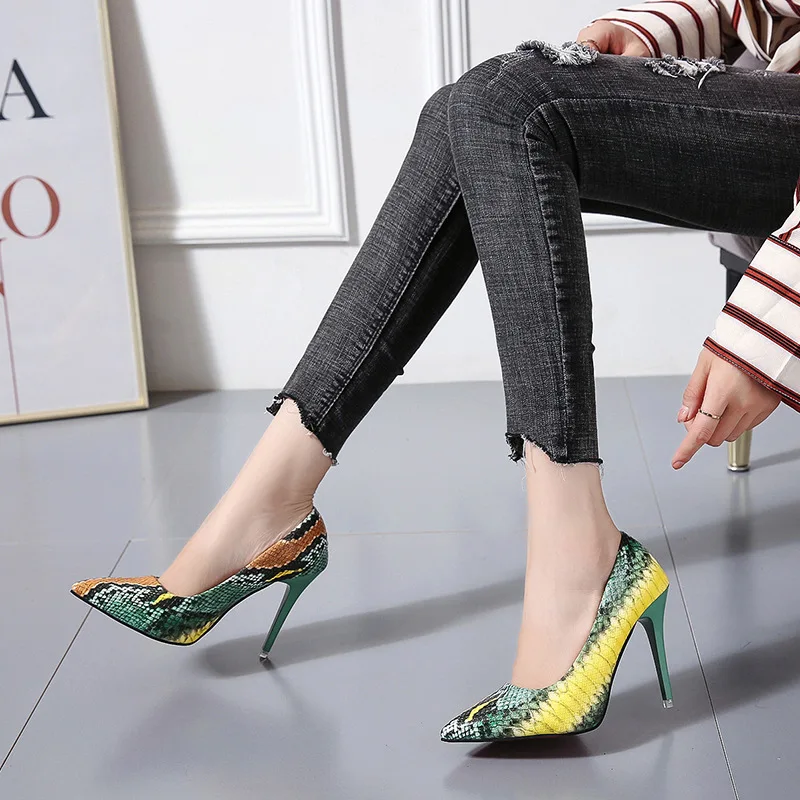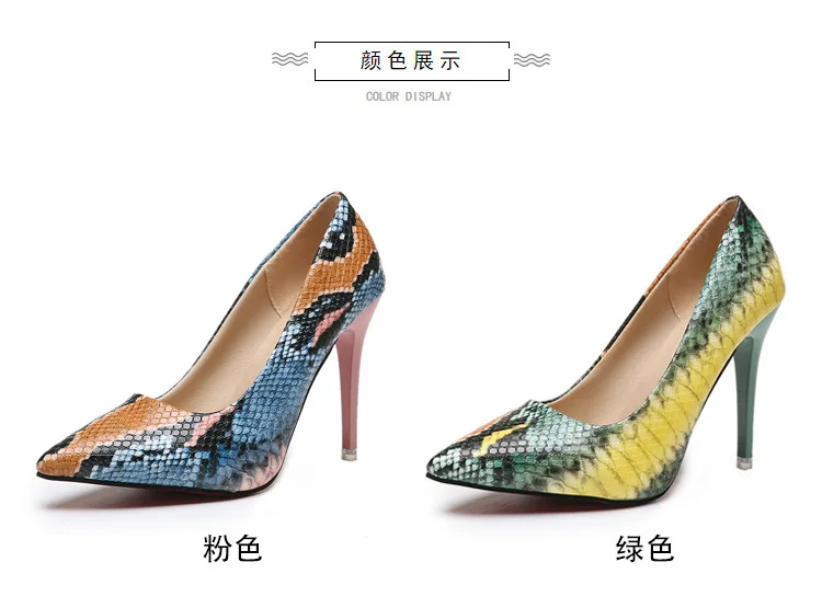 Женские туфли-лодочки из искусственной кожи, без застежки, на тонком каблуке 10 см, заостренный носок, змеиная кожа, туфли на высоком каблуке, Размеры 35-42