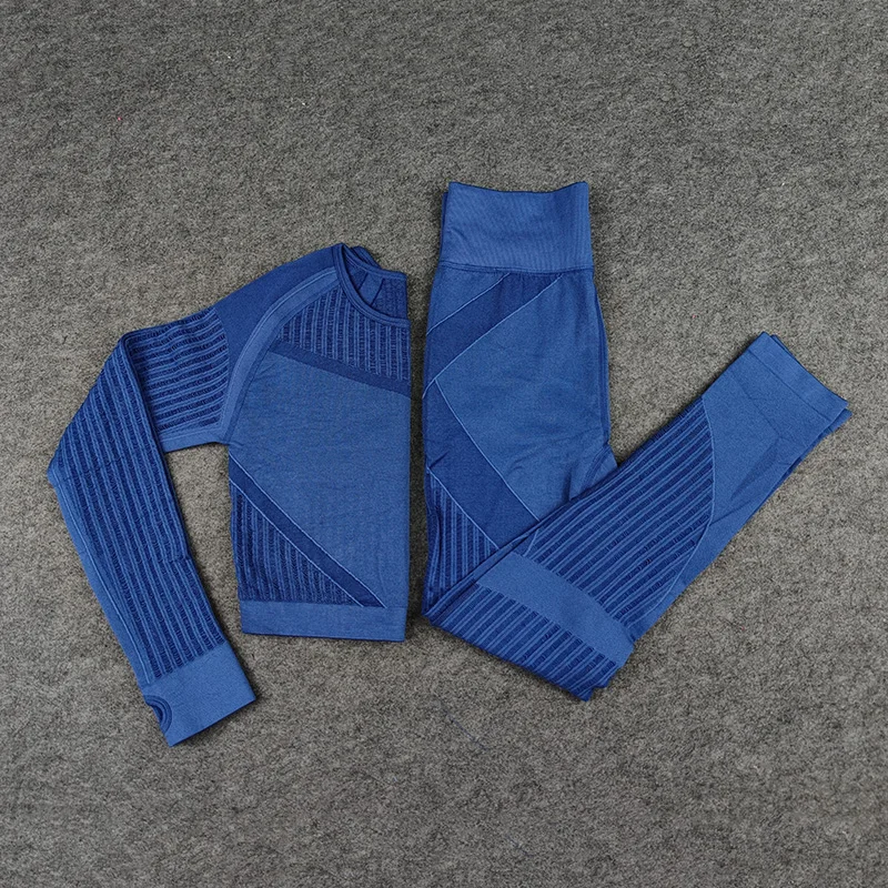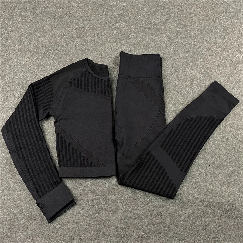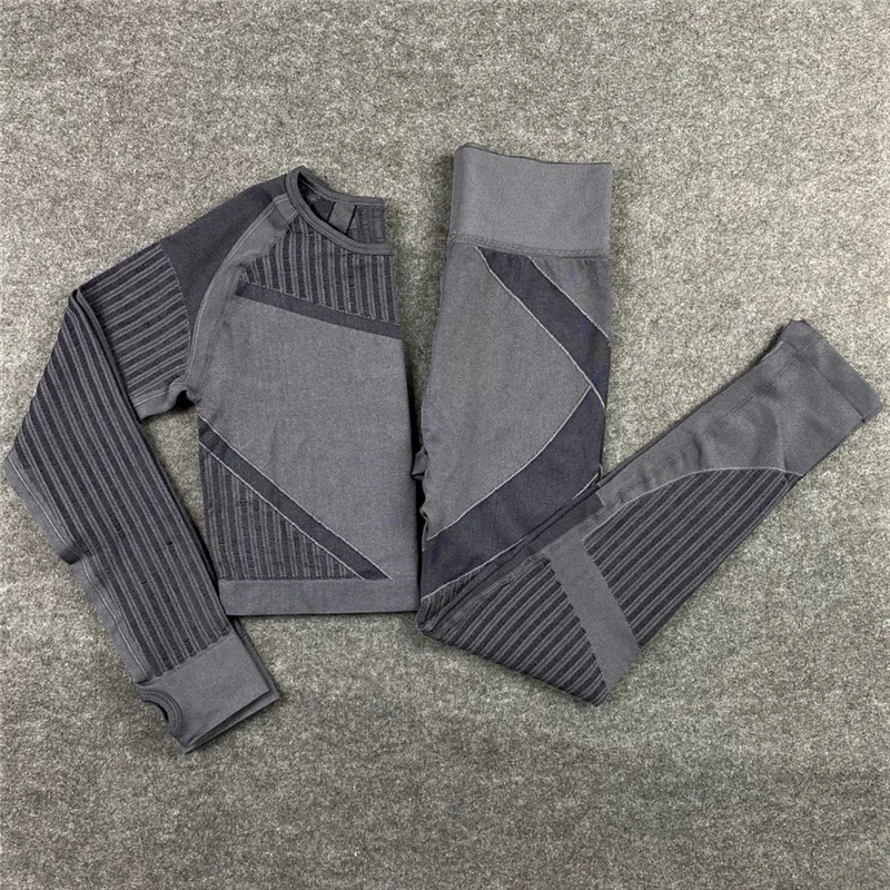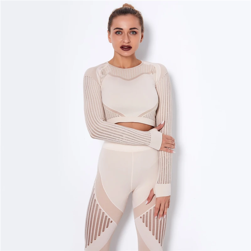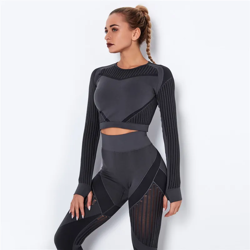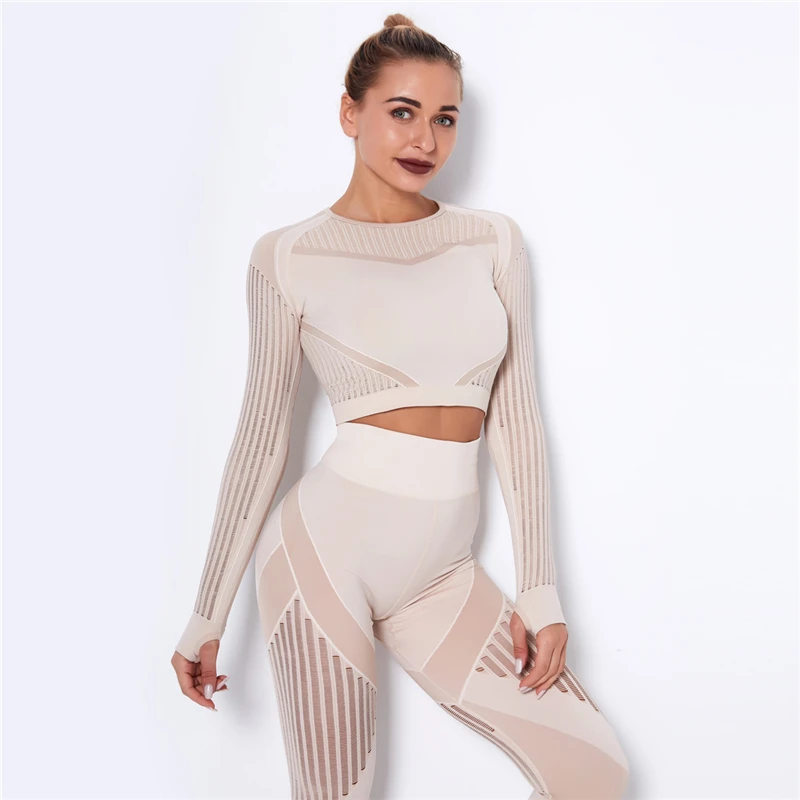 Женский бесшовный комплект для фитнеса, леггинсы для спортзала и фитнеса, ажурные укороченные рубашки, спортивный костюм, женский спортивный костюм с длинным рукавом, комплект для фитнеса в тренажерном зале