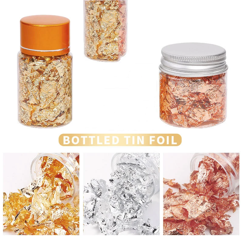 Золотой, серебряный или медный лист фольги хлопья листы-DIY Nail Art Поставки золочение Декор наклейки аксессуарыРазмер: 20 г банка, вес нетто фольги составляет около 3 г каждая банка