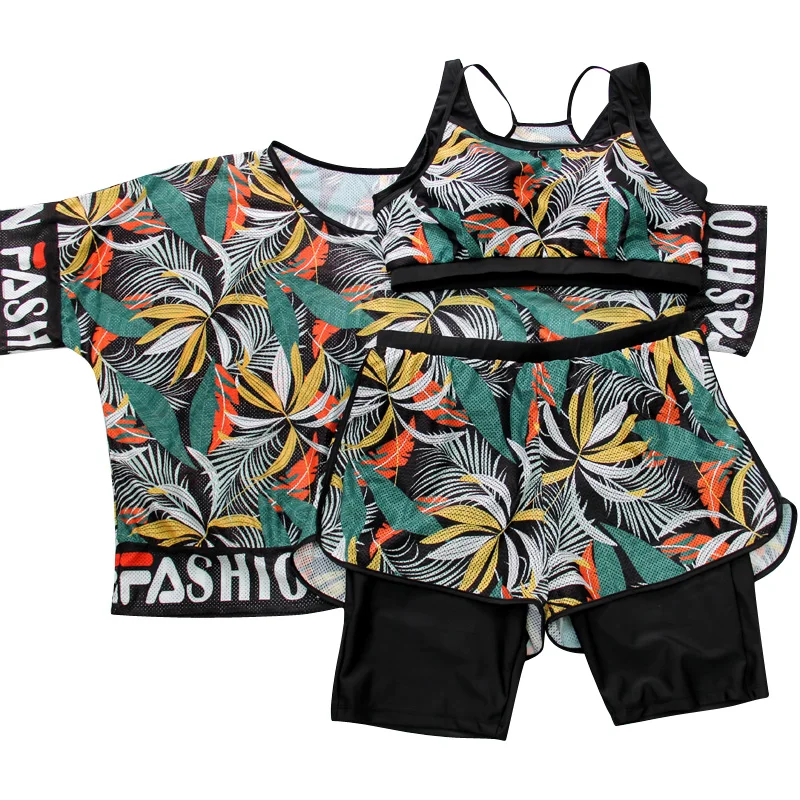 Размера плюс купальник из двух частей для женщин короткий рукав ванный комплект с буквенным принтом дышащие купальники ShortsTummy Управление раздельный комплект из 3 вещей