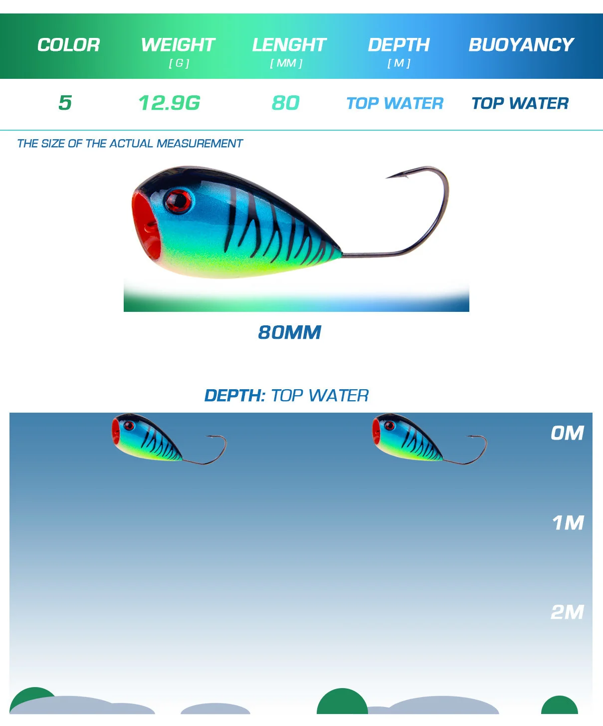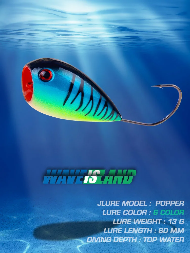 Информация о продукте: Бренд: WAVEISLAND Модель приманки: Поппер Тип приманки: жесткая рыболовная приманка Приманка Вес: 12,9 г Длина приманки: 80 мм Глубина погружения: вода сверху Плавучесть: Topwater Крючки: оснащены антикоррозийными крючками Глаза: 3D рыбий глаз Кольца: одинарные Цвета: 6 цветов