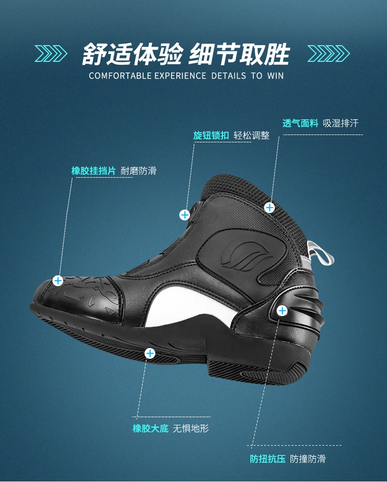1. Полностью материал из микрофибры, удобный и дышащий, обеспечивает отличную стойкость к истиранию и разрыву.2. Жесткая Шестерня из ПВХ и губка на лодыжке эффективно защищают ваши ноги.3. Переносная накладка с использованием супер-волоконного материала, износостойкая, практичная и удобная, доступна для езды на мотоцикле.4. Подошва изготовлена из RB резиновый, нескользящий и износостойкий, обеспечивает превосходное сцепление и обеспечивает естественную гибкость.5. Стелька из полимерного материала, удобная и дышащая, чтобы ваши ноги оставались сухими.6. Яркие цвета, модный дизайн, внешний вид, все показывают молодой модный стиль.7. Хорошо сочетаются с вашими повседневными брюками, джинсами. Обувь доступна в большинстве случаев, не только для езды на мотоцикле.