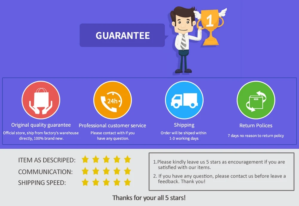 1. Вопрос: Как выбрать размер?Ответ: разные бренды, разные страны, размеры разные. Поэтому, пожалуйста, проверьте нашу таблицу размеров, чтобы выбрать правильный размер.Если вы не уверены в размере, пожалуйста, сообщите нам ваши измерения, тогда мы рекомендуем вам правильный размер.2. Вопрос: Что я могу сделать, когда время защиты покупки истекает?Ответ: если время защиты вашей покупки истекает, пожалуйста, свяжитесь с нами, и мы можем продлить его, чтобы защитить ваш заказ.3. Вопрос: Можете ли вы принять дропшиппинг?Ответ: Мы можем отправить товар непосредственно вашим клиентам и не оставим никакой информации о нас.4. Вопрос: Есть ли скидка на оптовый заказ?Ответ: Да, мы можем предоставить оптовую цену. Пожалуйста, свяжитесь с нами, чтобы получить лучшую оптовую цену.5. Вопрос: Есть ли таможенный налог?Из-за различных политик в разных странах могут быть таможенные пошлины или пошлины, которые должны быть оплачены покупателем.Если вы хотите снизить цену, пожалуйста, оставьте нам сообщение при размещении заказа.
