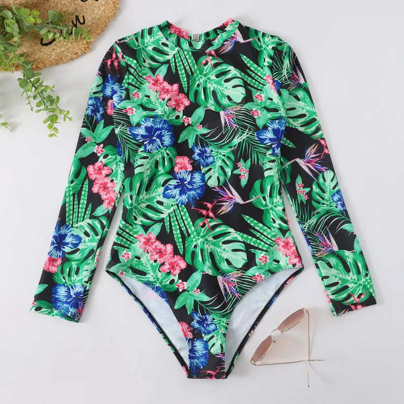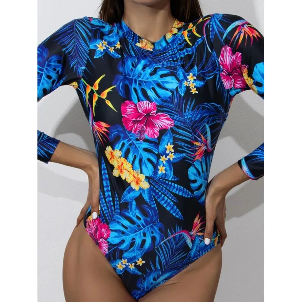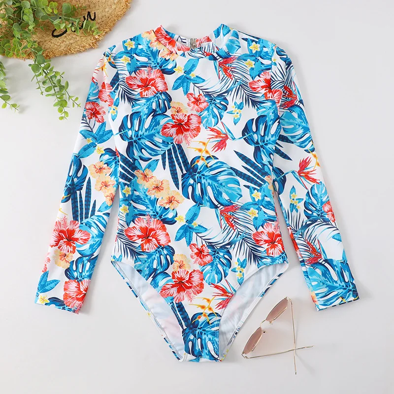 Женский слитный купальник с цветочным принтом, синий слитный купальник с длинным рукавом, винтажный купальный костюм в стиле ретро, лето 2022