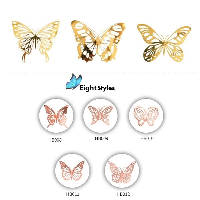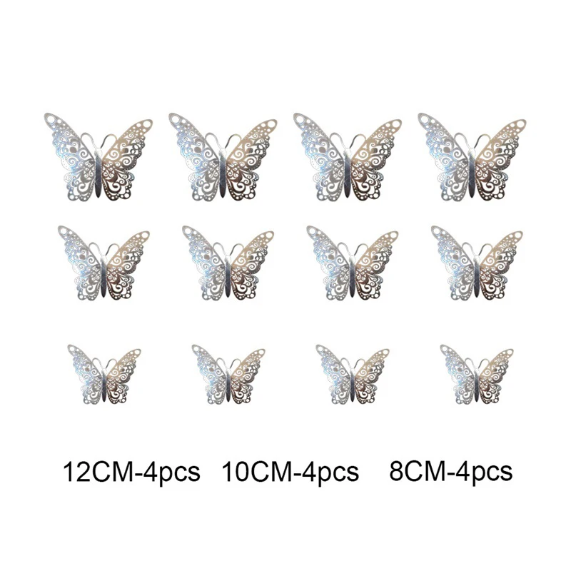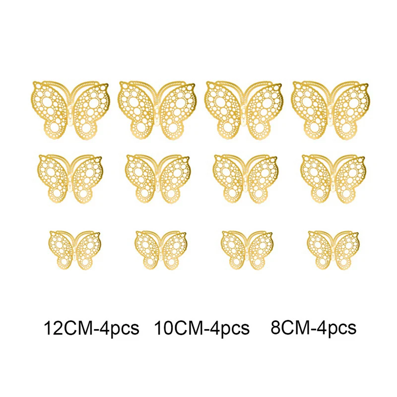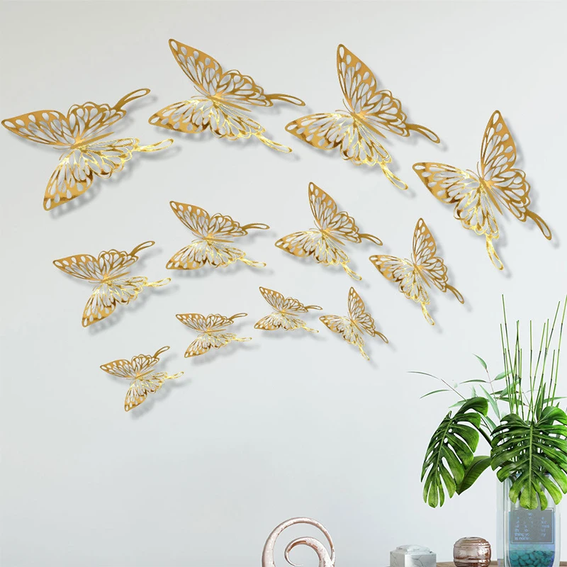 12 шт., 3D металлическая текстура, выдолбленная бабочка, Настенная Наклейка для гостиной, спальни, стерео наклейка-бабочка, украшение для дома и свадьбы