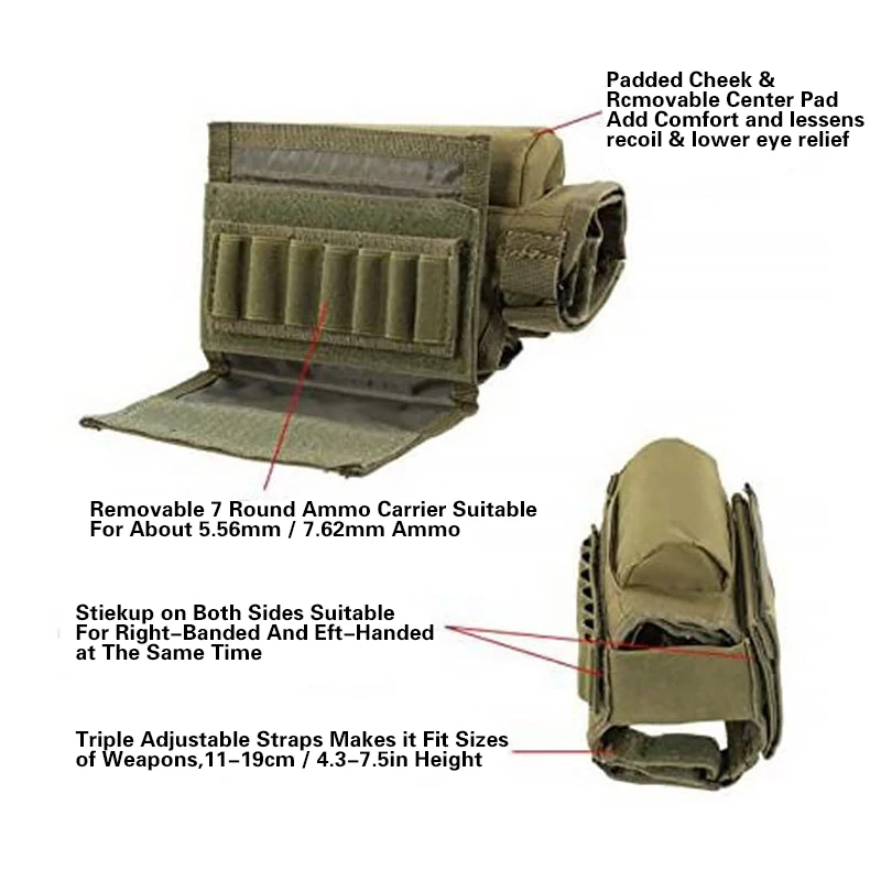 Тактическая корона для щек с переноской чехол для переноски амуниции для 5,56 мм и 7,62 мм Winmag Ambidextrous подставка для щек подходит для большинства фиксированных запасов винтовок Застежки-липучки для удобной посадки для левшей или правшей Съемная стеганая вставка включает в себя, чтобы помочь с наиболее естественной точки зрения Изготовлен из нейлона, чтобы предотвратить скольжение щек даже при повышении температуры Тройной ремень регулировки и ambidextrous дизайн Съемная Центральная Накладка для уменьшения рельефа глаз Съемные покрытые 7 круглых несущих патронов для 5,56 мм и 7,62 мм winmag Спецификация Материал: нейлон Размер: 15*18 см Цвет: черный/зеленый/коричневый Примечание: только прикладом для щек, другие аксессуары не включены. Содержимое посылка 1 * коронха бочеча ресто