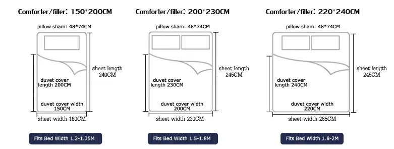 ● Размер США США Twin: 1 * пододеяльник 172 см x 218 см (68 "x 86"), 2 * наволочка 50 см x 75 см (19 "x 29"). США: 1 * пододеяльник 200 см x 229 см (79 "x 90"), 2 * наволочка 50 см x 75 см (19 "x 29"). Королева США: 1 пододеяльник 229 см x 229 см (90 "x 90"), 2 наволочки 50 см x 75 см (19 "x 29"). Король США: 1 пододеяльник 259 см x 229 см (102 "x 90"), 2 наволочки 51 см x 91 см (19 "x 36"). Флуоресцентный ● Размер AU AU Single:1 * пододеяльник 140 см x 210 см (55 "x 82"), 2 * наволочка 50 см x 75 см (19 "x 29"). AU Double:1 * пододеяльник 180 см x 210 см (71 "x 82"), 2 * наволочка 50 см x 75 см (19 "x 29"). AU Queen: 1 пододеяльник 210 см x 210 см (82 "x 82"), 2 наволочки 50 см x 75 см (19 "x 29"). AU King: 1 пододеяльник 245 см x 210 см (96 "x 82"), 2 наволочки 50 см x 75 см (19 "x 29"). Флуоресцентный ● Европейский размер Европейский стандарт: 1 пододеяльник 140 см x 200 см (55 "x 79"), 2 наволочки 50 см x 75 см (19 "x 29"). Двойной европейский размер: 1 пододеяльник 200 см x 200 см (79 "x 79"), 2 наволочки 50 см x 75 см (19 "x 29"). Европейский Король: 1 пододеяльник 240 см x 220 см (94 "x 86"), 2 наволочки 50 см x 75 см (19 "x 29"). Суперкороль ЕС: 1 пододеяльник 260 см x 220 см (102 "x 86"), 2 наволочки 50 см x 75 см (19 "x 29"). Флуоресцентный