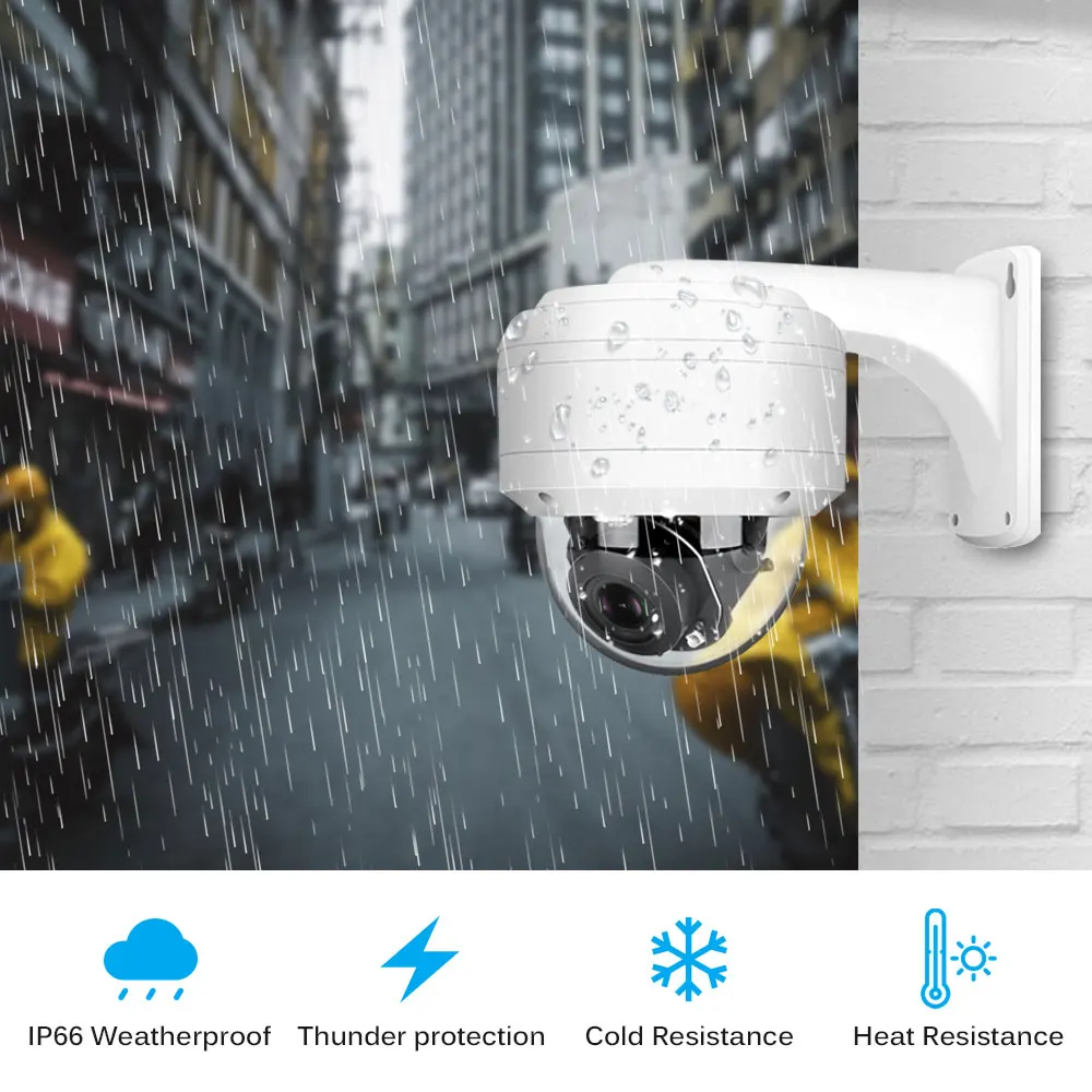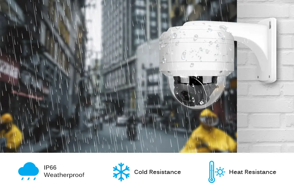 Используйте их в качестве наружных камер или крытых камер, так как они построены жестко, выдерживает любую погоду: дождь, снег, пыль и жаркие дни. С защитой от атмосферных воздействий IP66 и кабелями, просвечивающимися через подставку для защиты, гарантируем, что вы сможете ответить на их производительность, день в день. Наша камера имеет сверхпрочный металлический корпус, профессиональный IP66, устойчивый к атмосферным воздействиям, обеспечивая стабильную производительность как внутри, так и снаружи.