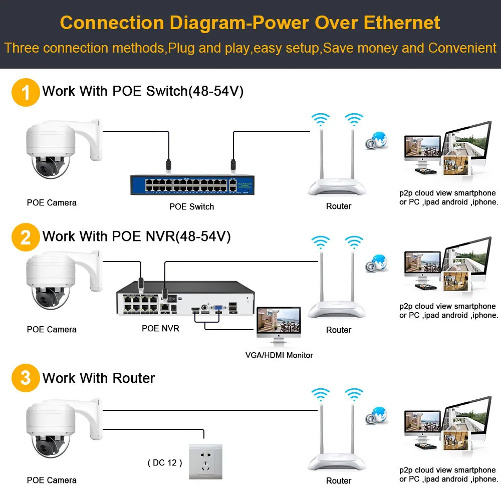 Нет дополнительных кабелей питания или адаптеров, просто подключив ip-камеру к NVR с помощью одного кабеля, вы можете легко завершить установку без знания о компьютере или сети и начать наслаждаться супер простым мониторингом среди вашего смартфона, планшета или ПК.