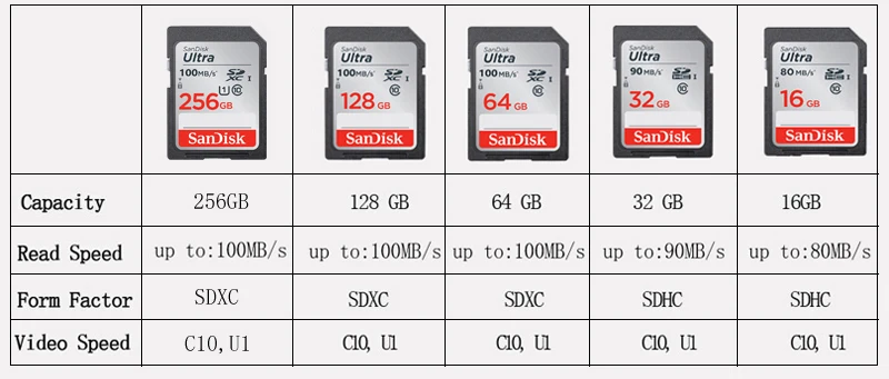 SanDisk SD-карта памяти, класс 10, 16 ГБ, 32 ГБ, 64 ГБ, 128 ГБ, 256 ГБ