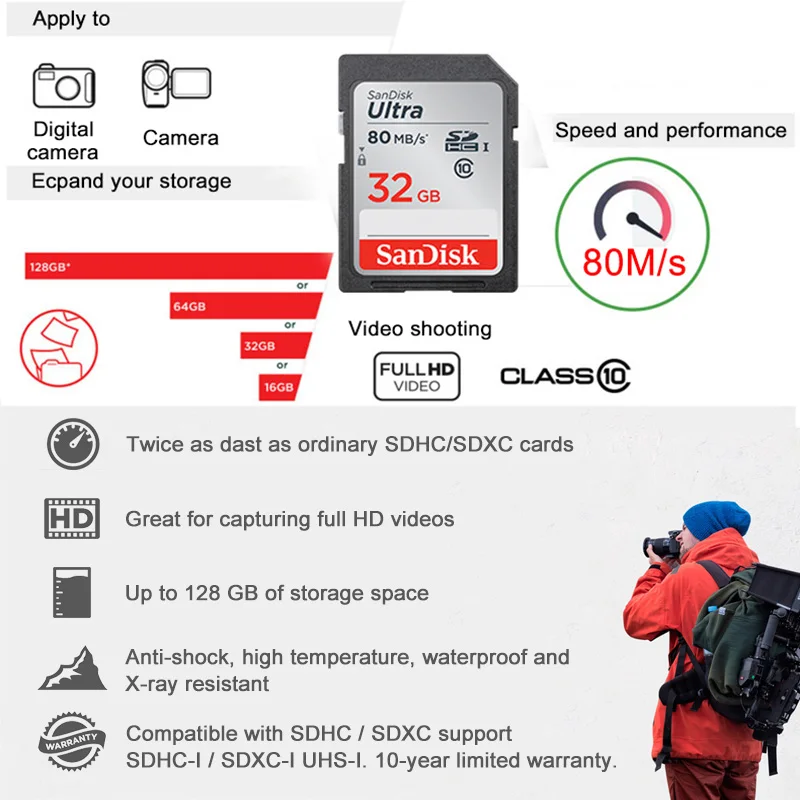Карта памяти SD SanDisk Ultra, класс 10, 32 ГБ, 16 ГБ, 64 ГБ, SD, S...
