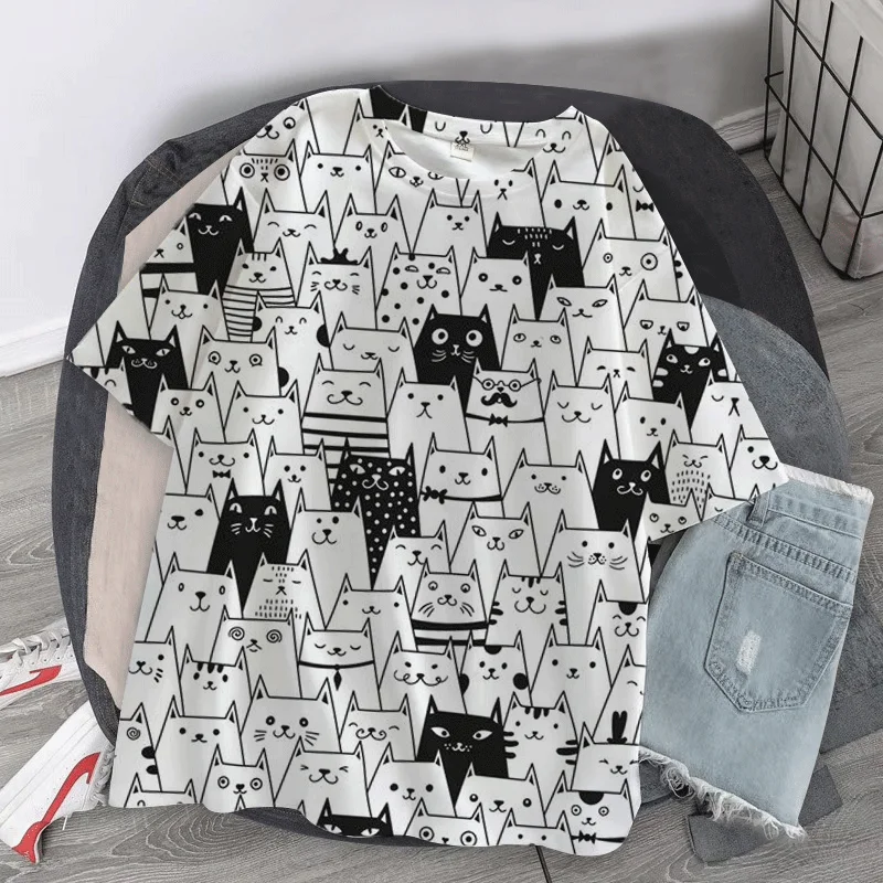 Футболка женская оверсайз в стиле Харадзюку, топ с объемным рисунком кота, летняя оверсайз футболка с коротким рукавом, y2k