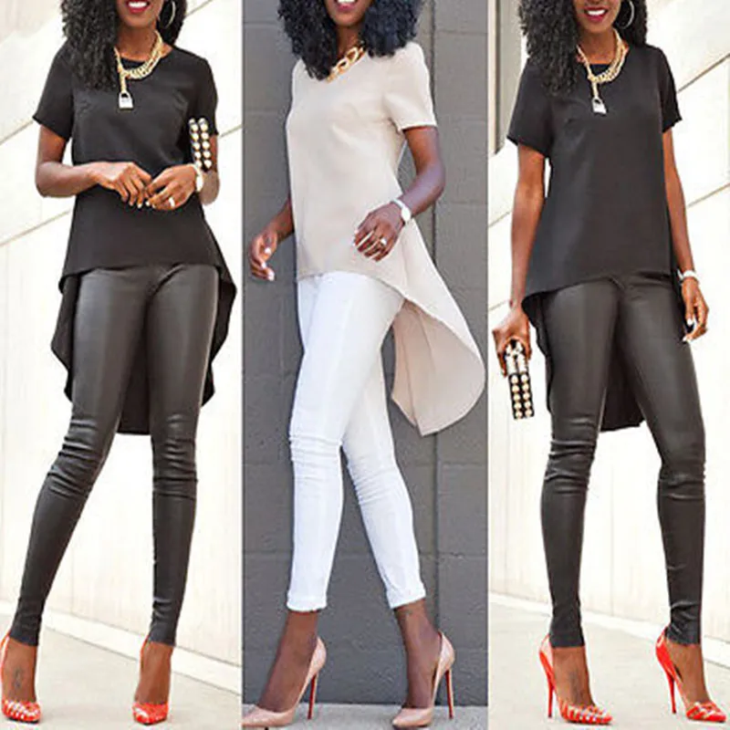 Летняя пикантная футболка Свободная шифоновая рубашка с коротким рукавом Повседневная Асимметричная однотонная спереди короткая сзади длинная юбка-жилет с ласточкиным хвостом