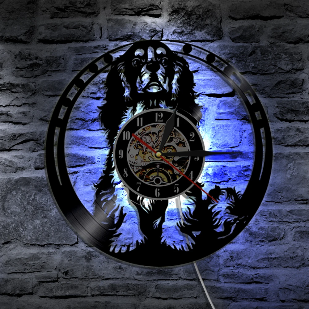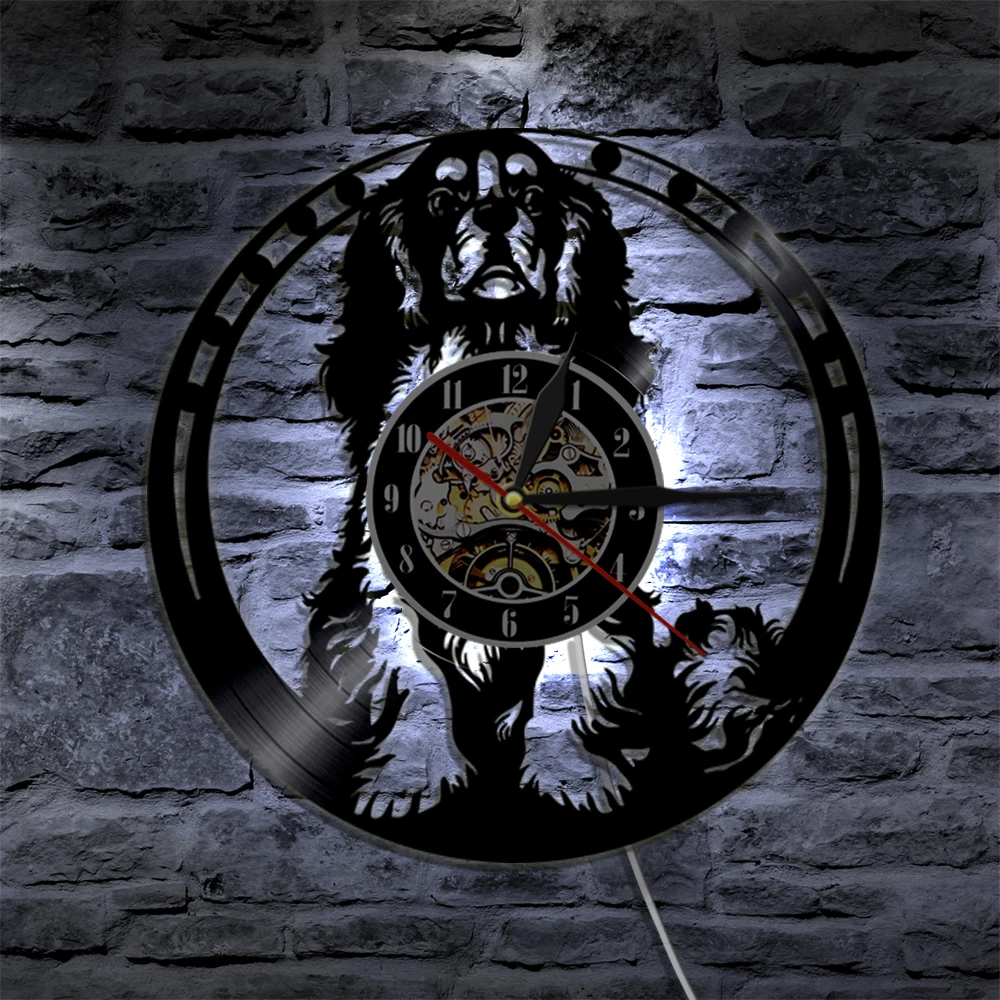 Настенные часы с изображением собаки короля Чарльза спаниеля, настенные часы с виниловой пластинкой, современный дизайн, светодиодный светильник для любителей животных, домашний декор, настенное искусство для бара