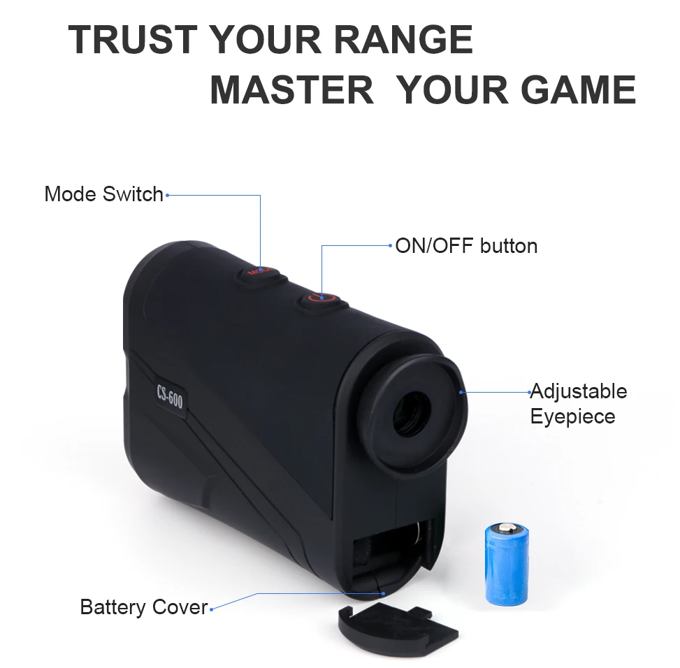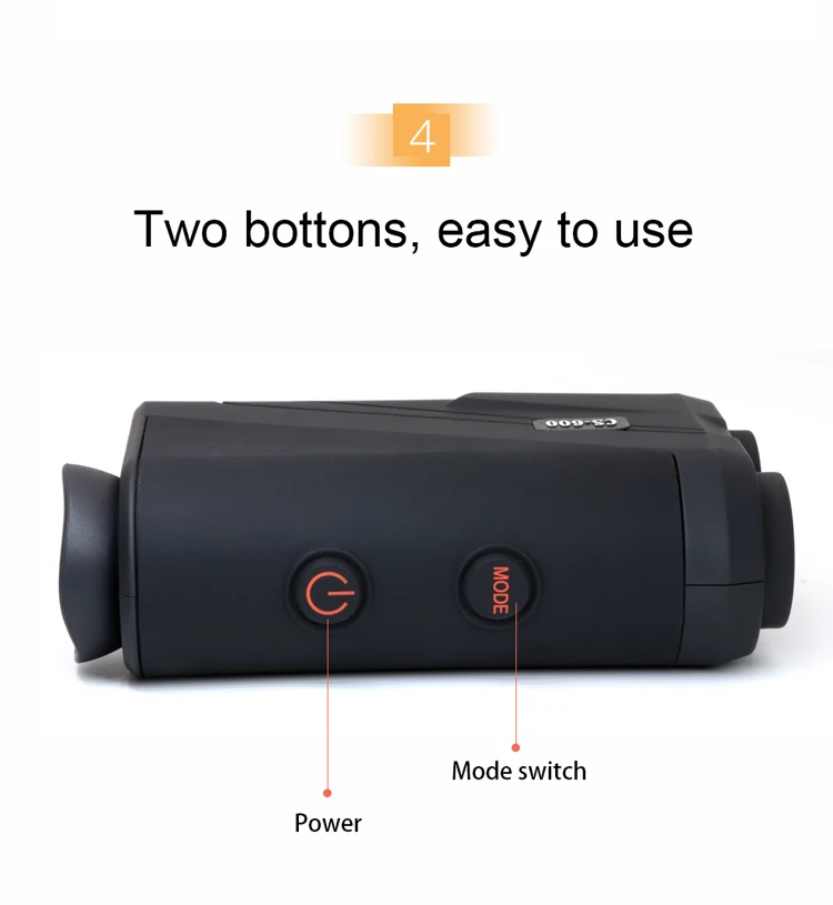 6. Операция Smiple: нажмите кнопку «Вкл/Выкл», чтобы открыть дальномер ---- нажмите кнопку «режим», чтобы изменить режим, который вы хотите ---- нажмите кнопку «Вкл/Выкл», чтобы сделать измерение. Диапазон измерения: 5-600 м/1000 м/1500 м (656 ярдов/1090 ярдов/1650 ярдов)