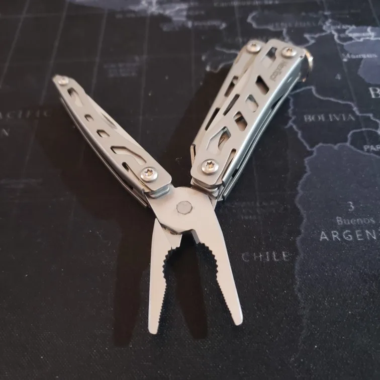 Очень компактный инструмент идеально подходит для EDC (носить его в кармане идеально) с весом 84 грамма, хорошей отделкой и все в стали. Очень интересный и хорошо сделанный, с очень компетентной ножницами, которая очень хорошо режет, хороший плоскогубцы для размера инструмента. Нет страховки в использовании, но опосредовано пружиной, очень приятно и удобно. Он может вытащить вас из более чем одного спешки, и по цене это супер интересная покупка, на самом деле я заказал два.