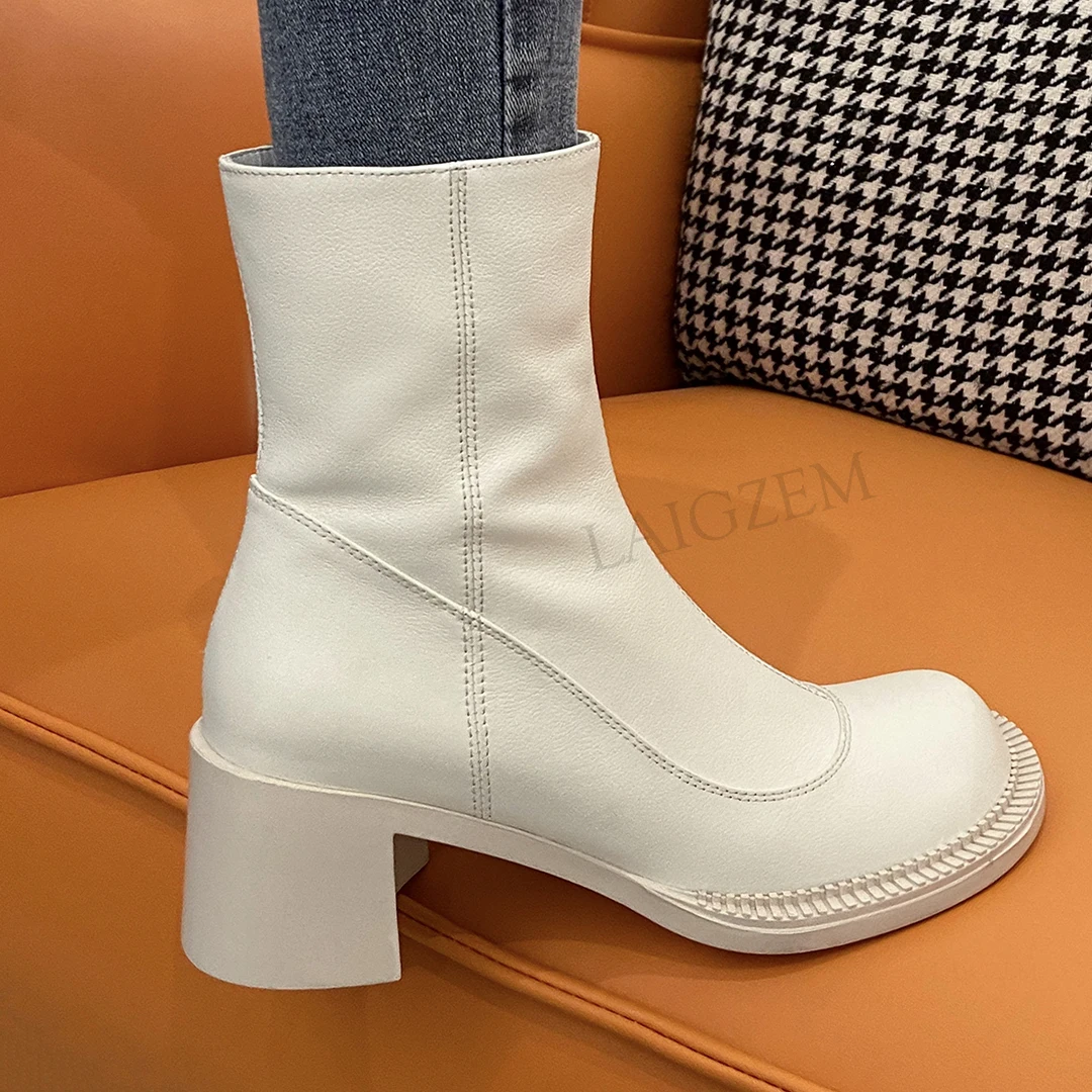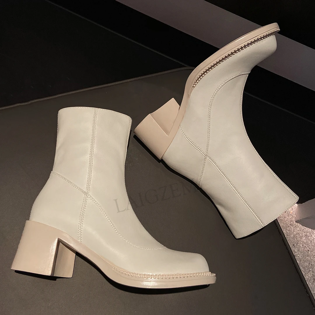 LAIGZEM Модные женские полусапожки с застежкой-молнией сбоку; Блок 5,5 см; Женские туфли из натуральной кожи, женские сапоги, повседневная женская обувь с большим Размеры размерный ряд: 33-42-43