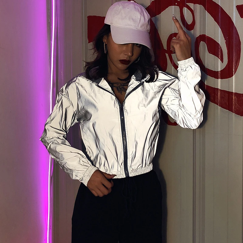 Светоотражающая куртка Женский спортивный костюм хип-хоп толстовки женские куртки водонепроницаемые ветровки пальто Мужская мода размера плюс укороченный топ 2021