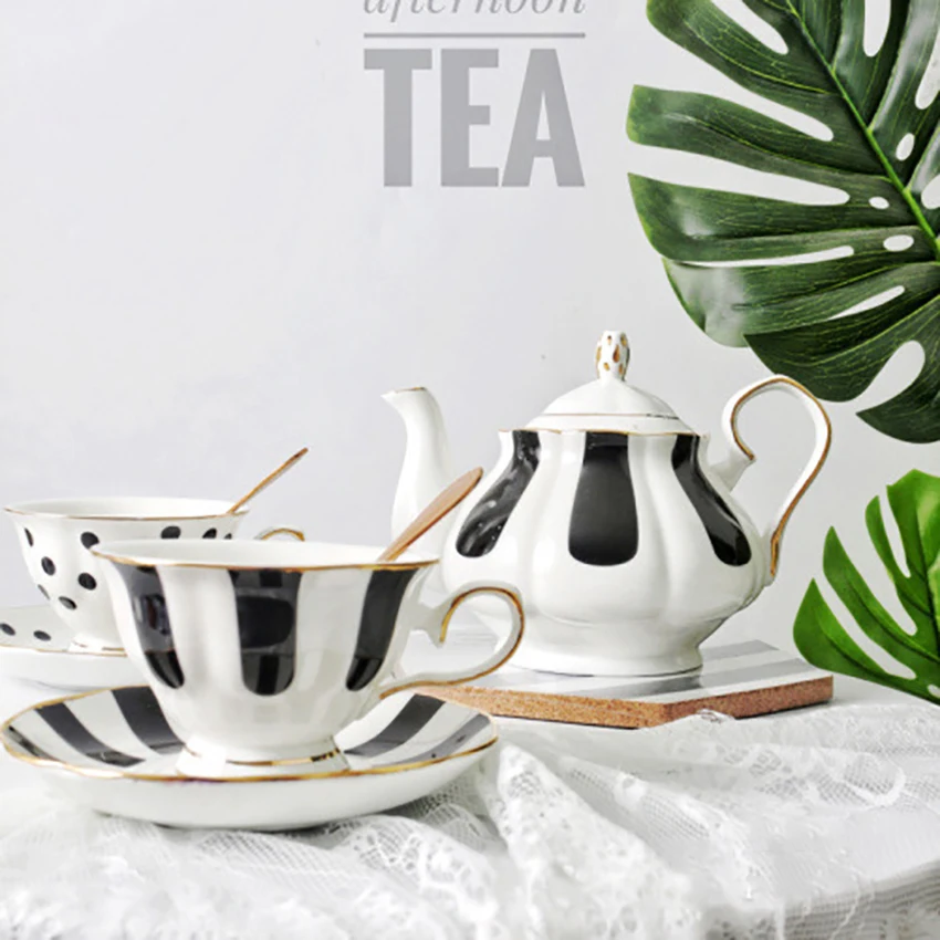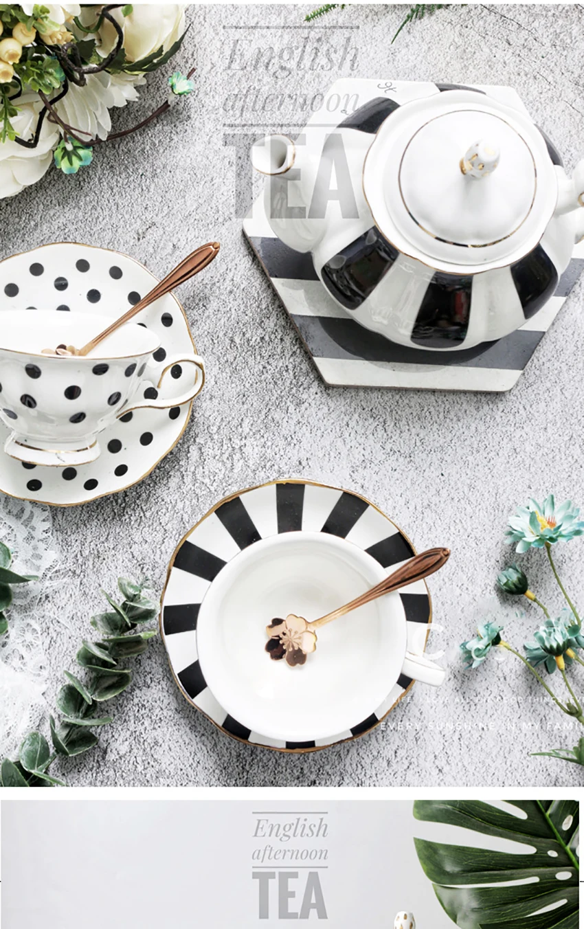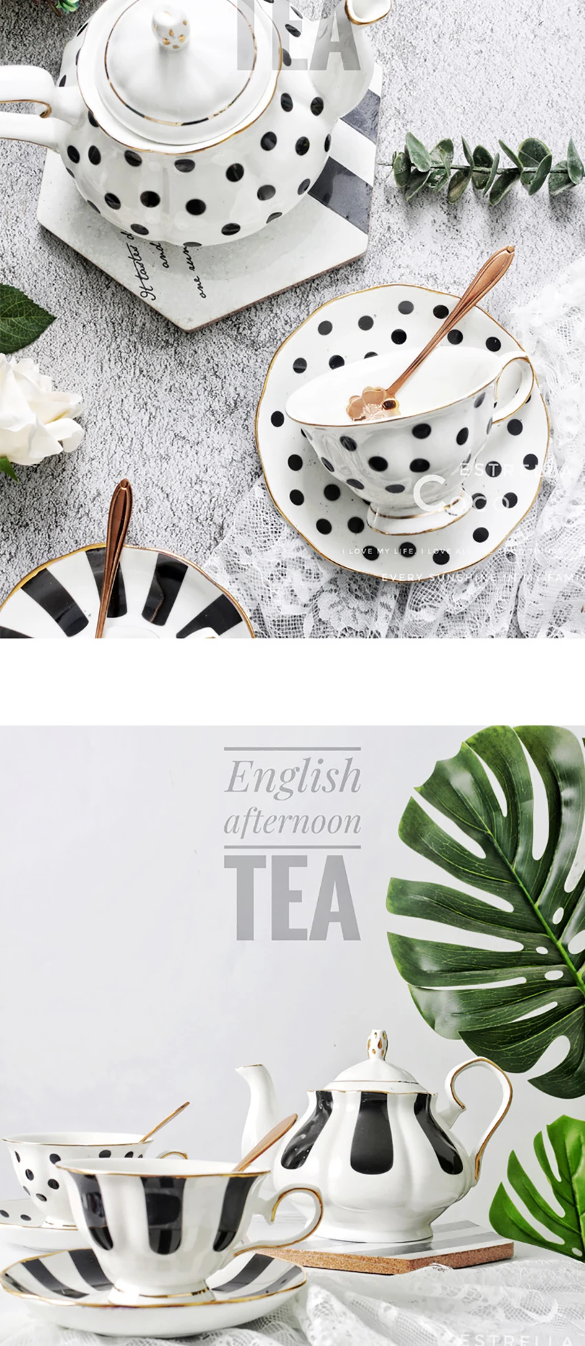 Керамические кофейные чайные чашки с блюдцами, черно-белые полосатыеточечные чашки и блюдца, чайный горшок с золотистыми полями для латте, чая