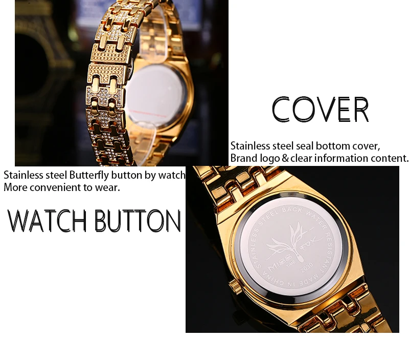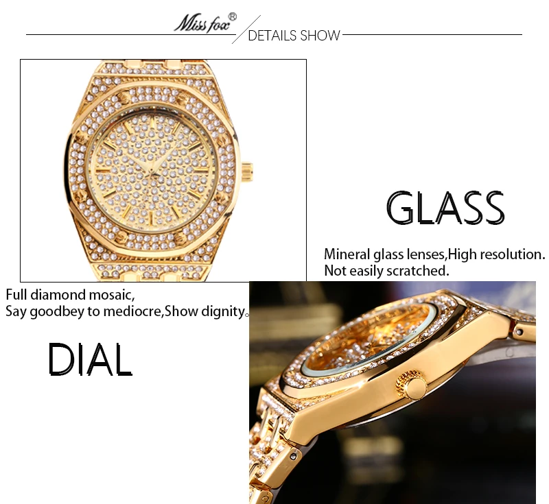MISSFOX топ роскошные женские часы брендовые золотые с бриллиантами Женские часы лучшие продажи водонепроницаемые женские часы с подарочной коробкойСтиль: роскошный-Большой алмаз-100% новый и высокое качество.-Точный кварцевый механизм для точного сохранения времени.-30 м Водонепроницаемость (не для душа и плавания), ударопрочность-18K золото нано вакуумное покрытие, золотой цвет не выцветает.-Ватенлайн, рождественский подарок, отжиг, вечерние, день рождения, одежда для свиданийХарактеристики (прибл.):Чехол диаметр: 3,4 см прибл.Чехол Толщина: 0,8 см прибл.Материал корпуса: нержавеющая сталь 316LГруппа Ширина: 1,6 смДлина ремешка: около 21,0 смМатериал ремешка: нержавеющая сталь 316LРегулируемый ремешок: Да, может быть продлен, свяжитесь с нашей Золотой службой поддержки клиентовПосылка включает в себя:Оригинальные часы MISSFOX-1 шт.