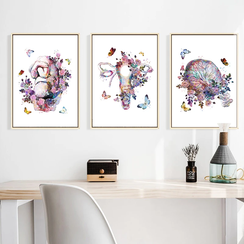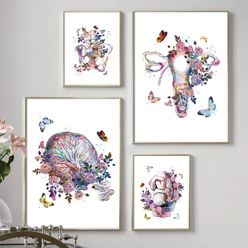 Плакат медицинский акварельный для беременных, художественная живопись плода, цветка, матки, плаценты, анатомия матки, Подарочный акушерский