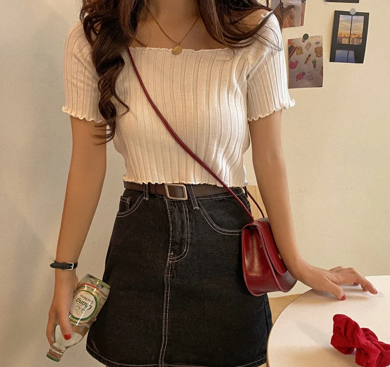 Кроп-топ женский трикотажный с квадратным вырезом, короткий рукав, ...