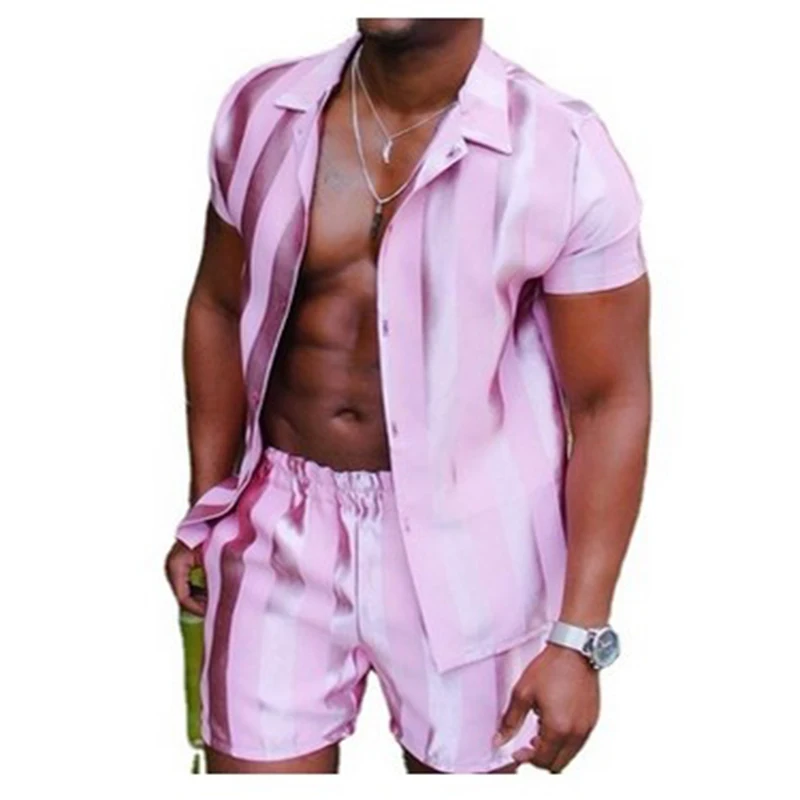 Костюм мужской Пляжный из 2 предметов, рубашка с отложным воротником и короткими рукавами, Повседневные Шорты Для отпуска, гавайский костюм в полоску, уличная одежда, лето 2021