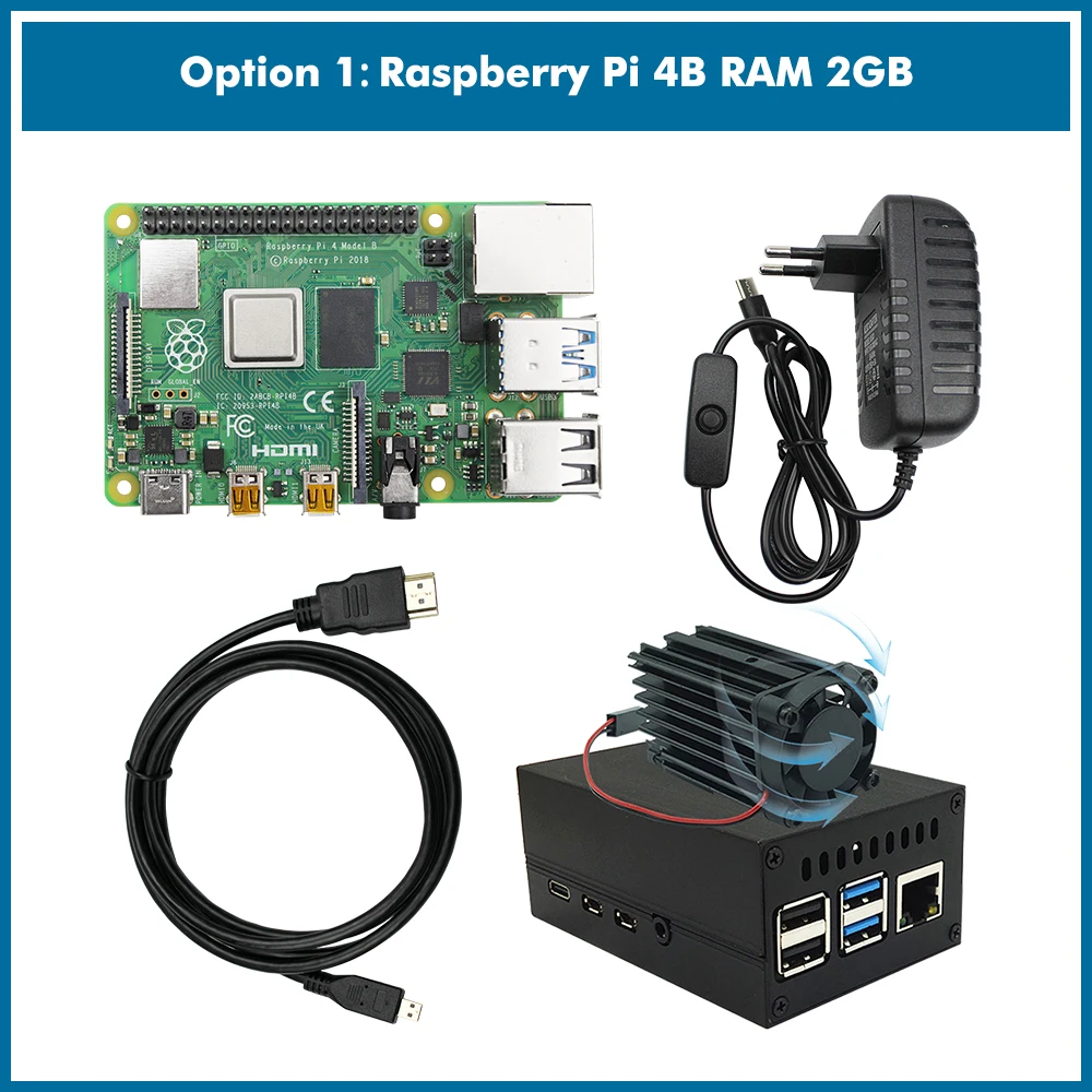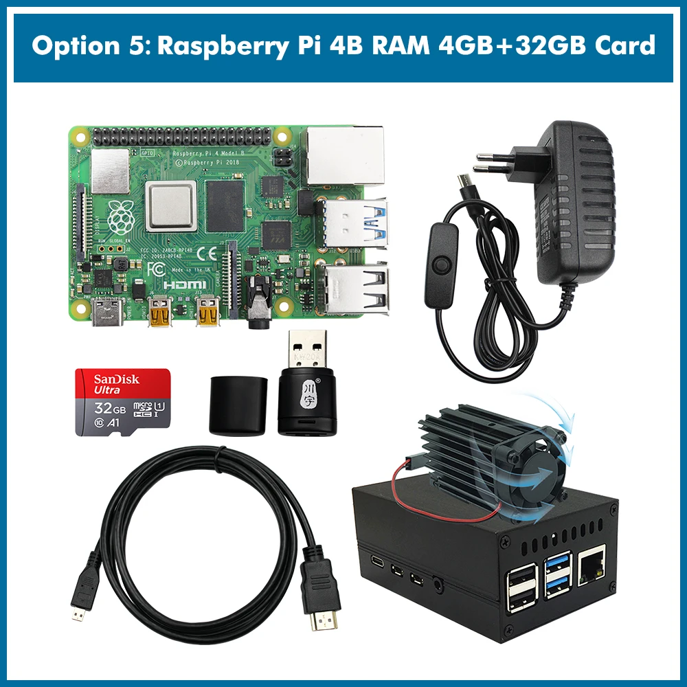 Плата Raspberry Pi 4 Model B в комплекте с алюминиевым чехлом, тихим вентилятором охлаждения 25 мм, адаптером питания, SD-картой, кабелем HDMI, RPI 4B