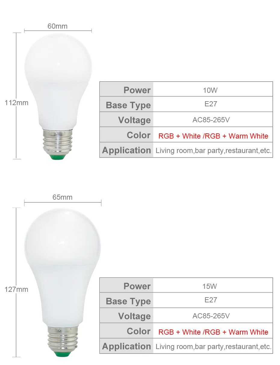 Тип цоколя: E27 RGB лампаМощность: 5 Вт/10 Вт/15 Вт