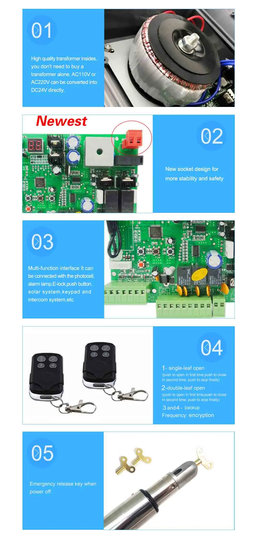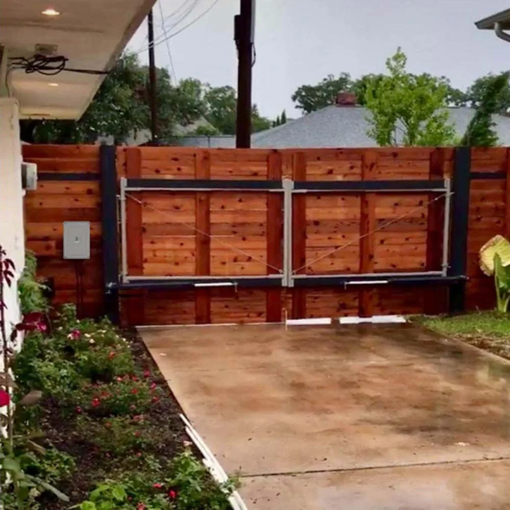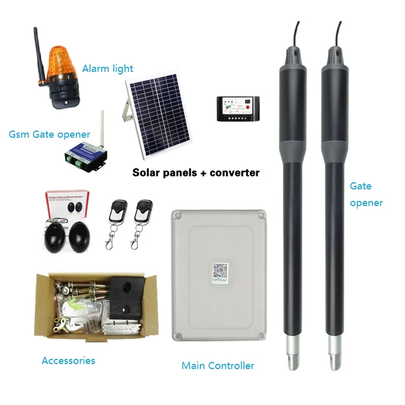 Эта система открывания ворот с двумя рычагами является надежной, долговечной, мотор может обрабатывать легкие ворота. Операторы распашных ворот-это изящный дизайн телескопической шестерни, которая изготовлена из нержавеющей стали с корпусом двигателя из литого сплава. Два мотора изготовлены из металла (без пластика, волокна или нейлона).