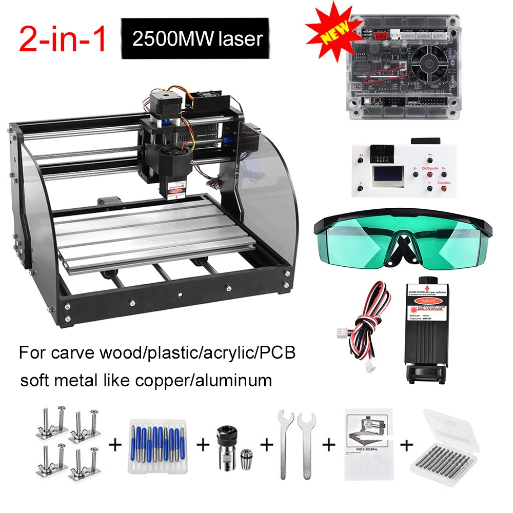 【Новая версия 】 2-в-1 CNC 3018-PRO с2500 МВтЛазерная головка-это обновленная версия 3018 года. Не нужно размещать все компоненты, что значительно снижает сложность сборки и повышает точность работы. Кроме того, высота основания поднята до 4 см для лучшей устойчивости.