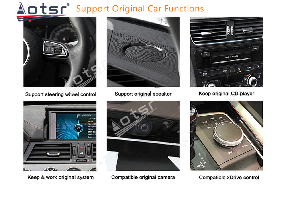 1. Поддержка управления рулевым колесом2. Поддержка оригинального динамика3. Сохраните оригинальный CD-плеер4. Оригинальная система сохранения и работы5. Совместимость с оригинальной камерой6. Совместимость с управлением xDrive7. Может переключаться на оригинальную систему