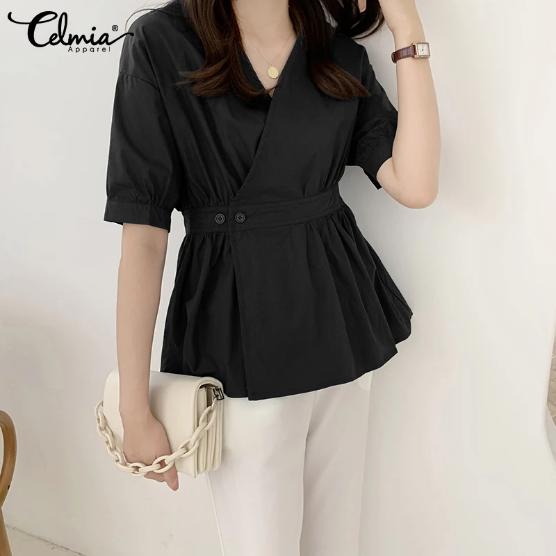 Женские топы с баской Celmia 2021, летняя повседневная плиссированная блузка с коротким рукавом, модная рубашка с запахом и V-образным вырезом, туника с открытыми плечами