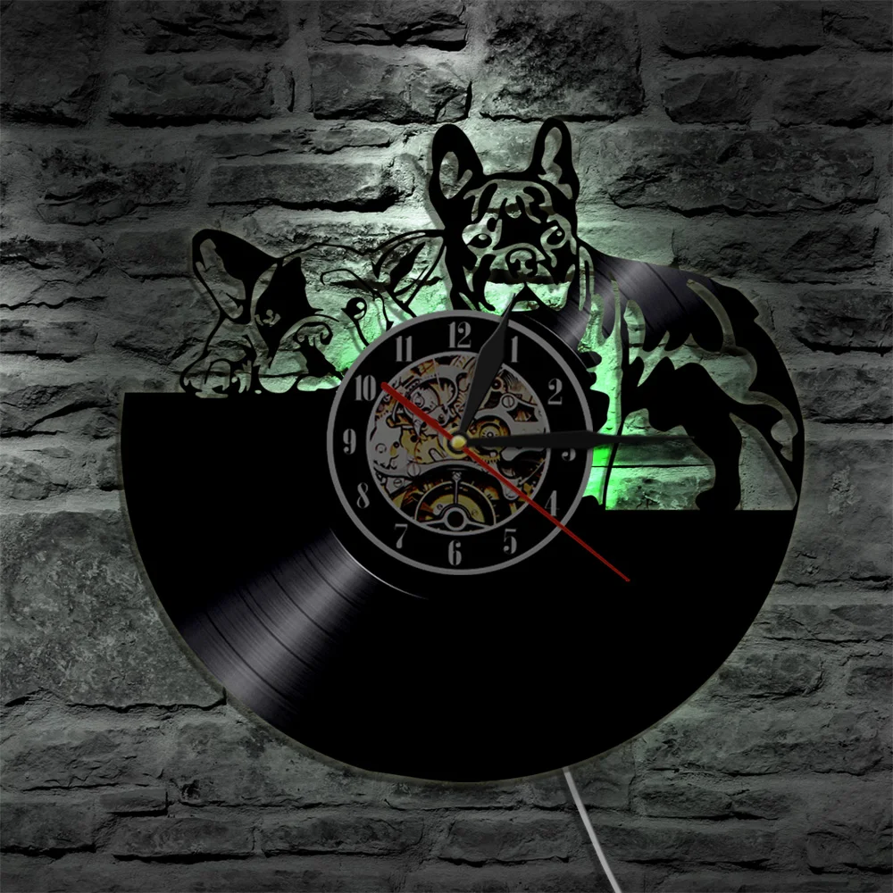 Frenchie щенок собака настенные часы собаки породы Французский бульдог декоративные виниловые настенные часы с светодиодный светильник Pet Shop стены искусства знак