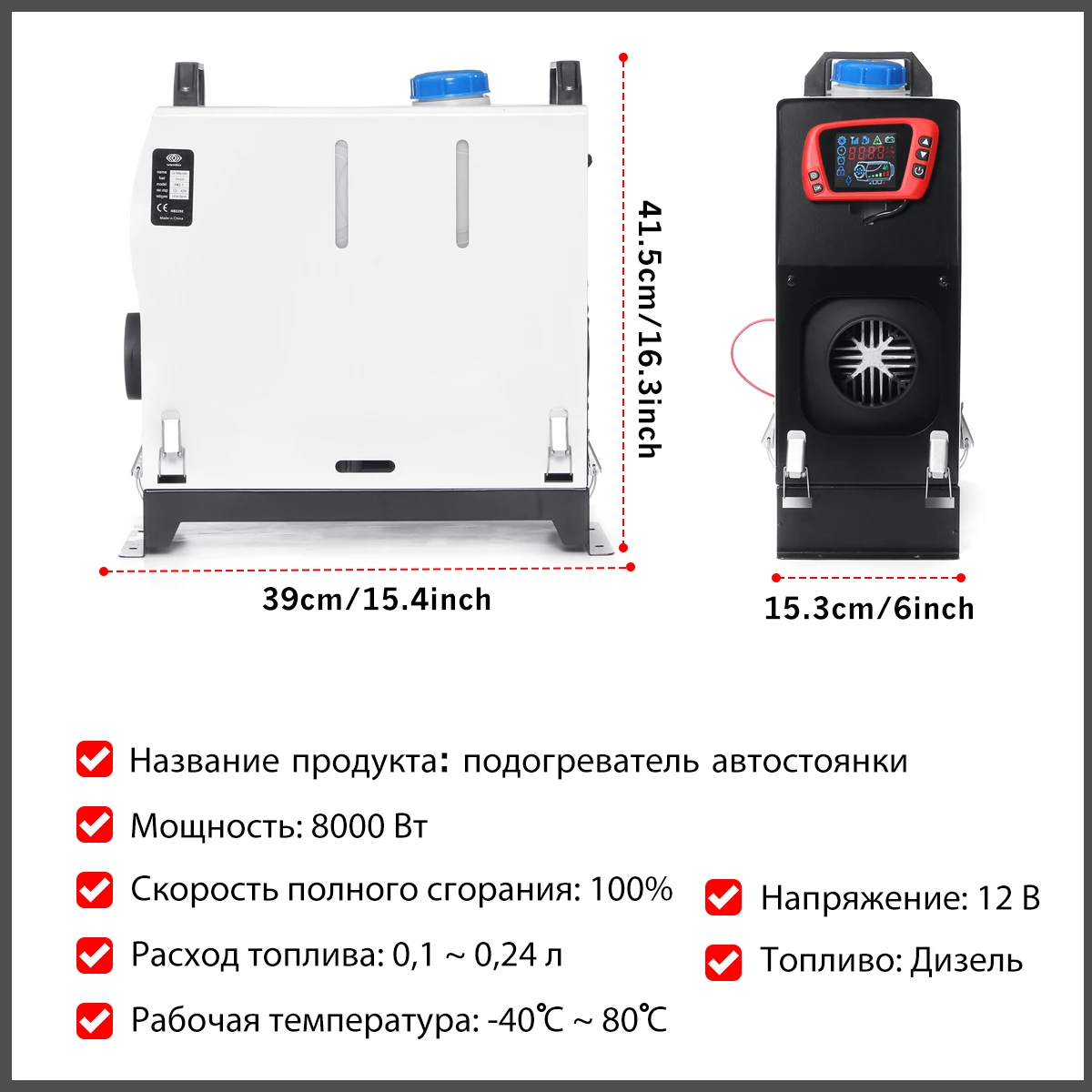 Характеристики:Материал: металл + пластикЦвет: белый + черный;Размеры: 15,3 × 39 × 41,5 см (6 × 15,4 × 16,3 ")Напряжение: 12 ВМощность: 8000 ВтТопливо: ДизельПолный коэффициент сгорания: 100%Расход топлива: 0,1 ~ 0,24 лРабочая температура: -40 °C ~ 80 °C