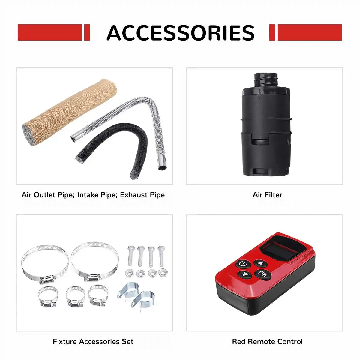 Посылка включает в себя:1 x парковочный обогреватель (ЖК-термостат)1 x красный пульт дистанционного управления (батарейки в комплект не входят)1 х воздуховодная труба1 х впускная труба1 х выхлопная трубаНабор аксессуаров для крепления-1 шт.