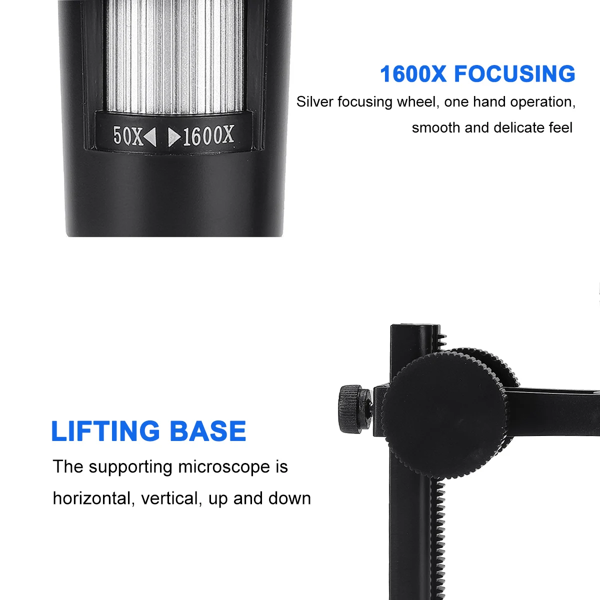 Цифровой микроскоп, 1600X, профессиональный, USB, 8 светодиодов, 2 Мп, электронный микроскоп, эндоскоп, увеличительная камера, подъемная стойка, адаптер