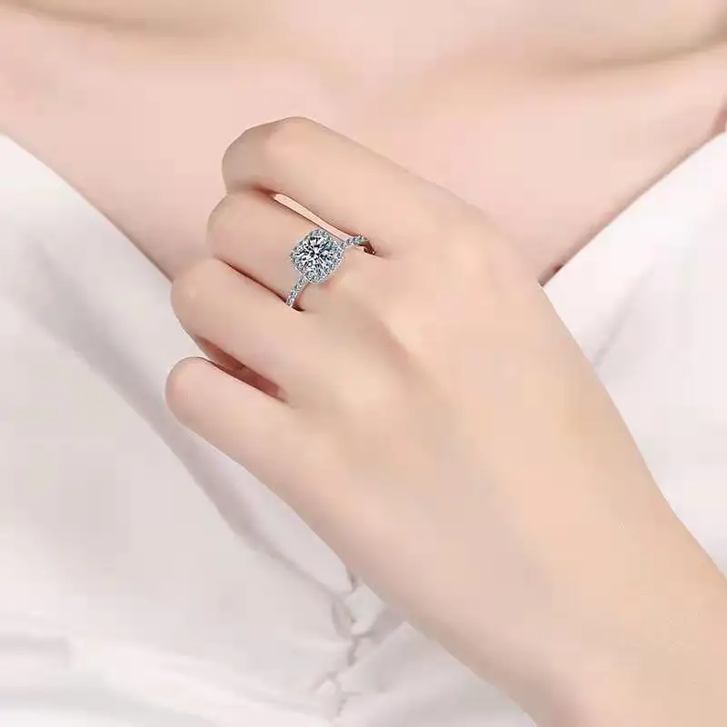 Муассанит один дрель кольцо прошел Diamond тесты камень 925 Стерлинговое Серебро 4-коготь квадратное кольцо 0,5-2CT модные свадебные Роскошная бумажная коробка подарка