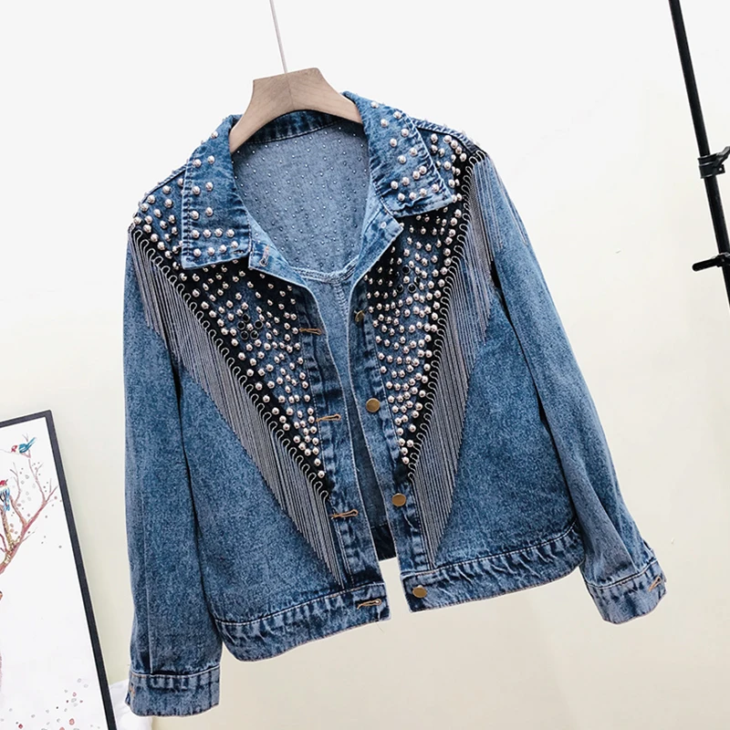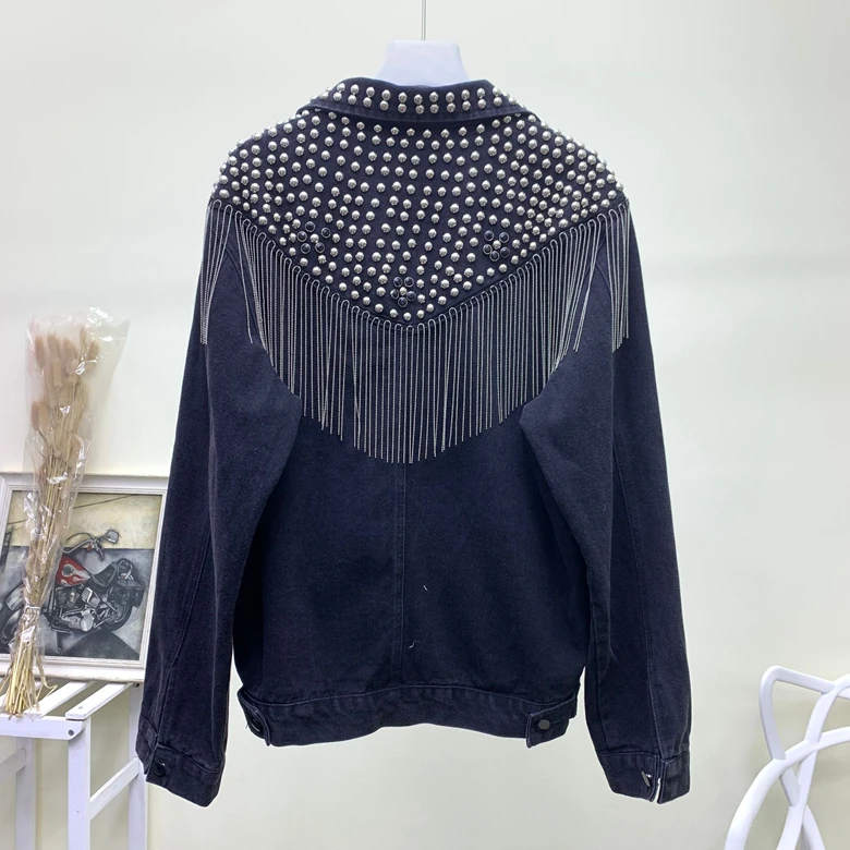 Куртка женская джинсовая с кисточками и заклепками, Модный Черный Т...