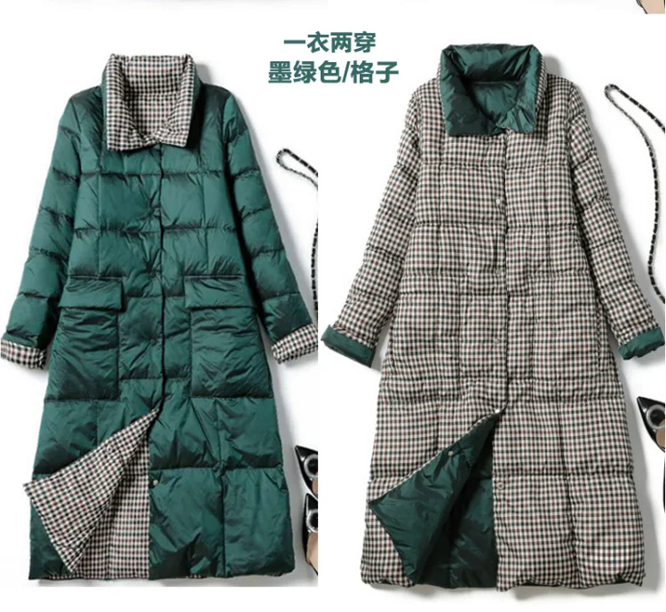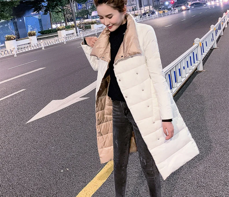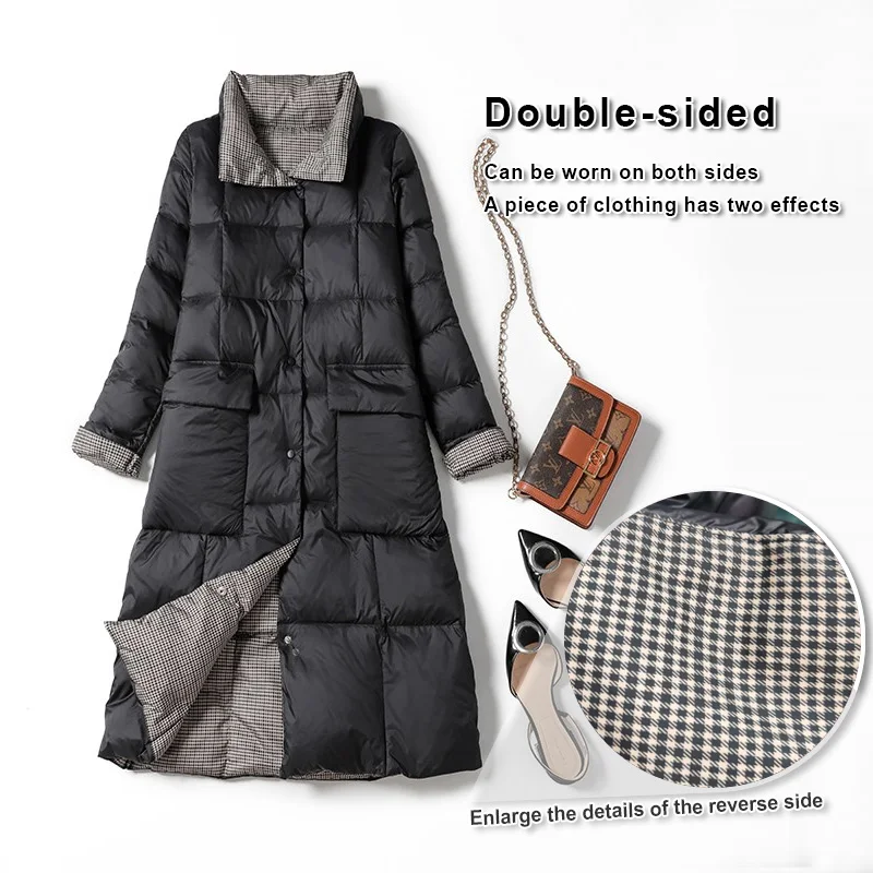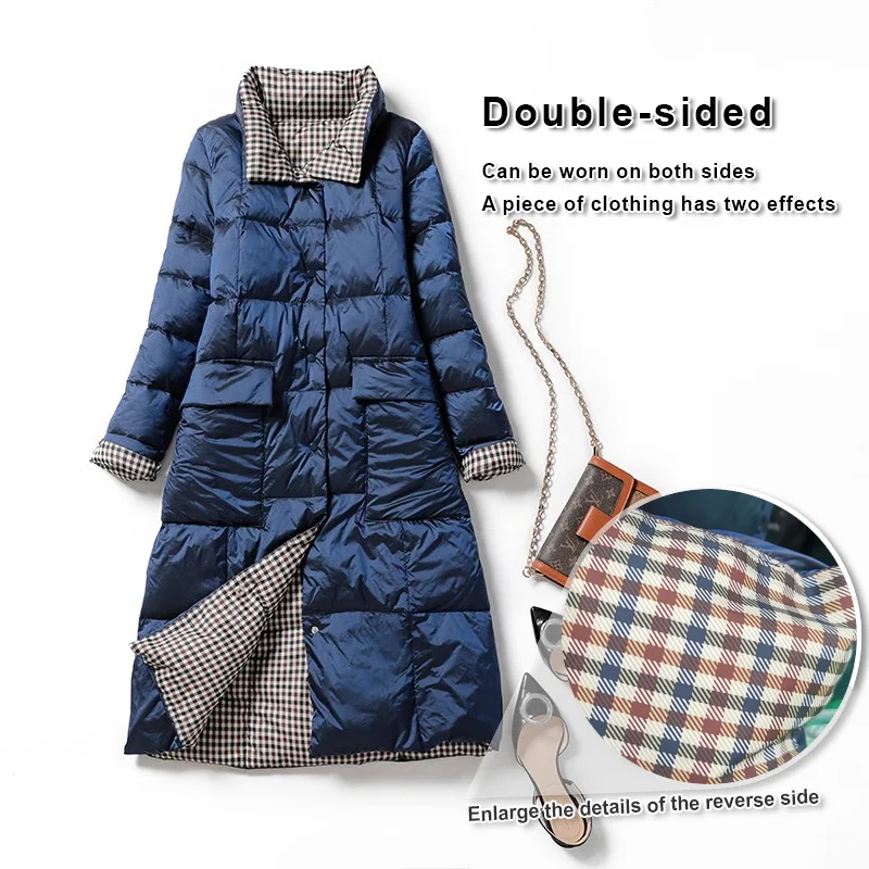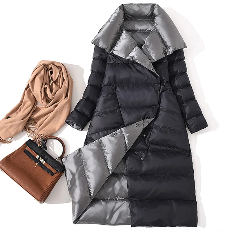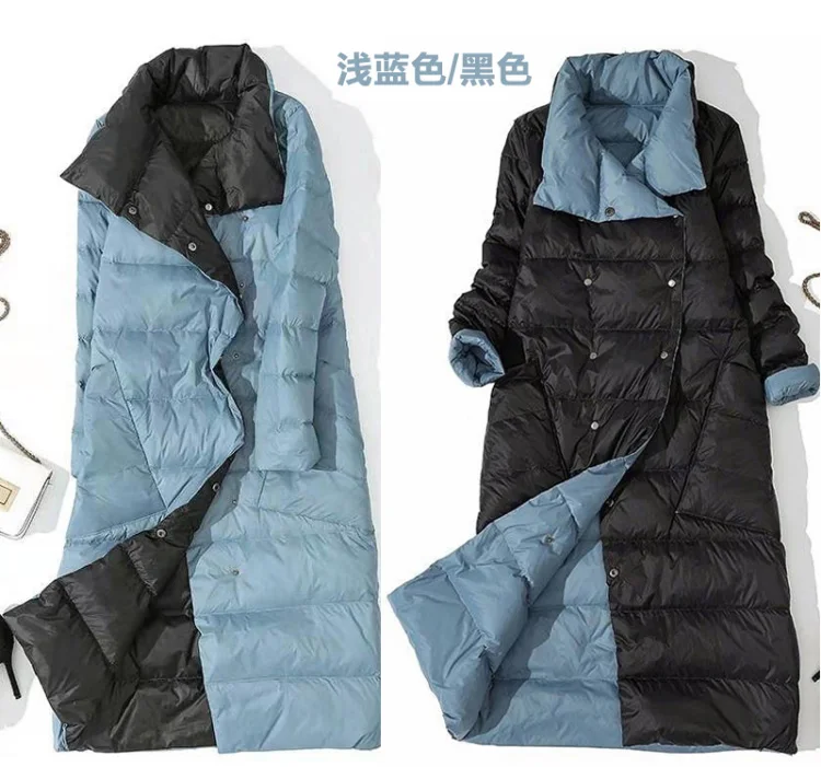 Женский Двухсторонний пуховик, Длинная зимняя куртка с высоким воротником, пальто на белом утином пуху, двубортные теплые парки, зимняя верхняя одежда