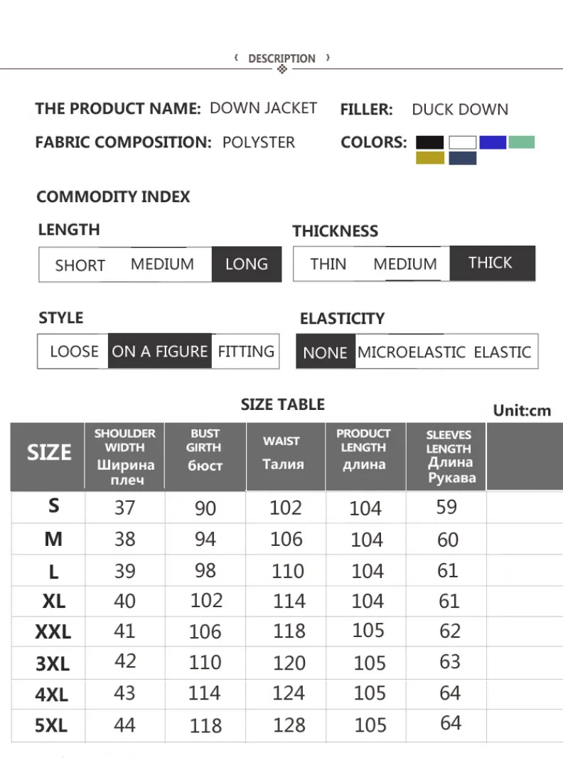 Пуховик супер! Тонкий на тёплую весну и осень. Подошёл на параметры 100-78-105. Если хотите посвободнее, то лучше на размер больше, он впритык. Всё как в описании! Цвет изумительный! Доставка вовремя! С продавцом небыло необходимости общаться, почитала отзывы и заказала.