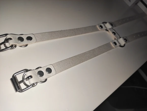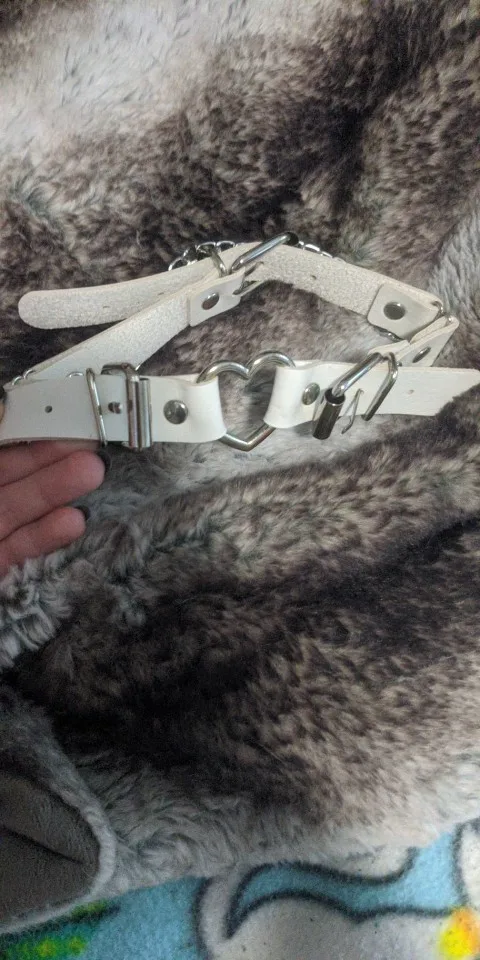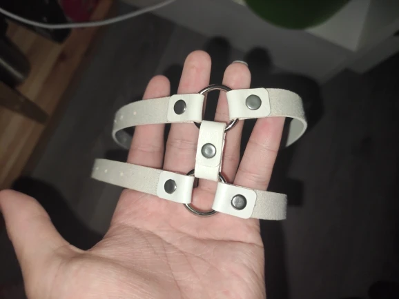Кайфовый чокер! Выглядит так, как я и хотела. Большие кольца, приятные пропорции. Ремешок для моей шеи очень длинный, возможно обрежу его, но зато подойдёт на любой размер. Материал необычный, с лица шуршит как что-то среднее между тканью и плотным картоном. Не знаю, как будет в носке, но я и надевать его собираюсь не особенно часто.