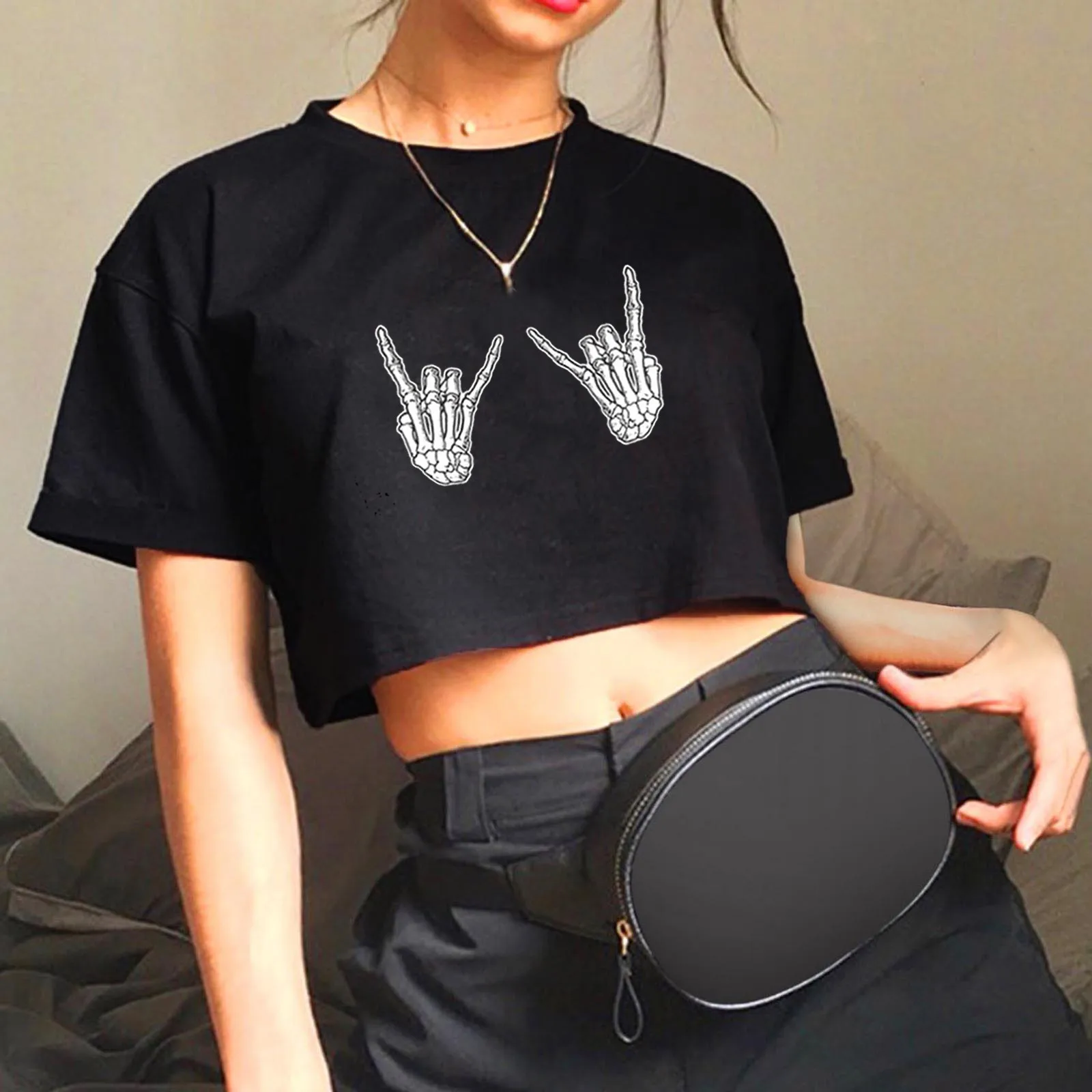 Укороченный топ в стиле Харадзюку, женская футболка с забавным принтом черепа, с высокой талией, с коротким рукавом, Готическая блузка, летняя уличная одежда, футболка