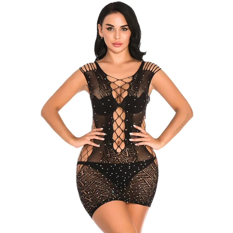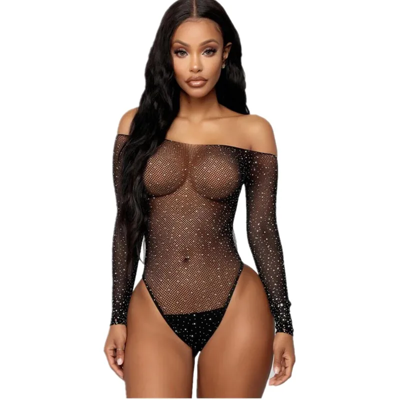 Сетчатый боди сексуальное нижнее белье боди Стразы с открытыми плеч...