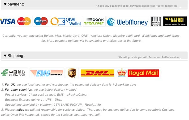 1. Если ваш заказ небольшой (заказ <$7), мы отправим его без полной информации об отслеживании, потому что это может сэкономить ваши расходы на перевозку. Если вам нужна полная информация об отслеживании, Пожалуйста, разместите больший заказ (заказ> $7) или выберите способ доставки, который вы хотите, и Оплатите стоимость доставки.