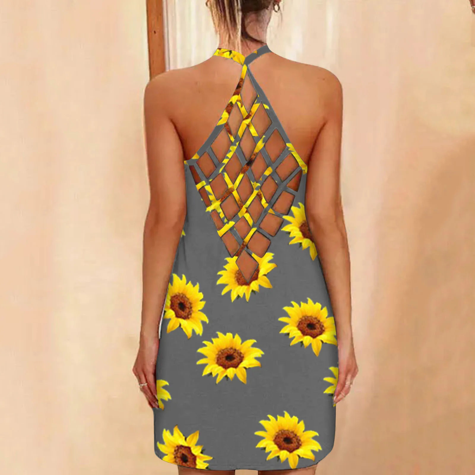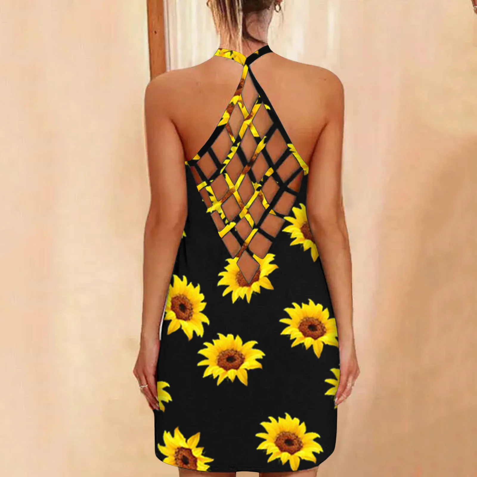 Женская летняя одежда с принтом в виде подсолнухов, Открытое платье без рукавов с О-образным вырезом без рукавов сексуальное открытое платье с открытой спиной богемное Sukienka Vestidos De Verano #30