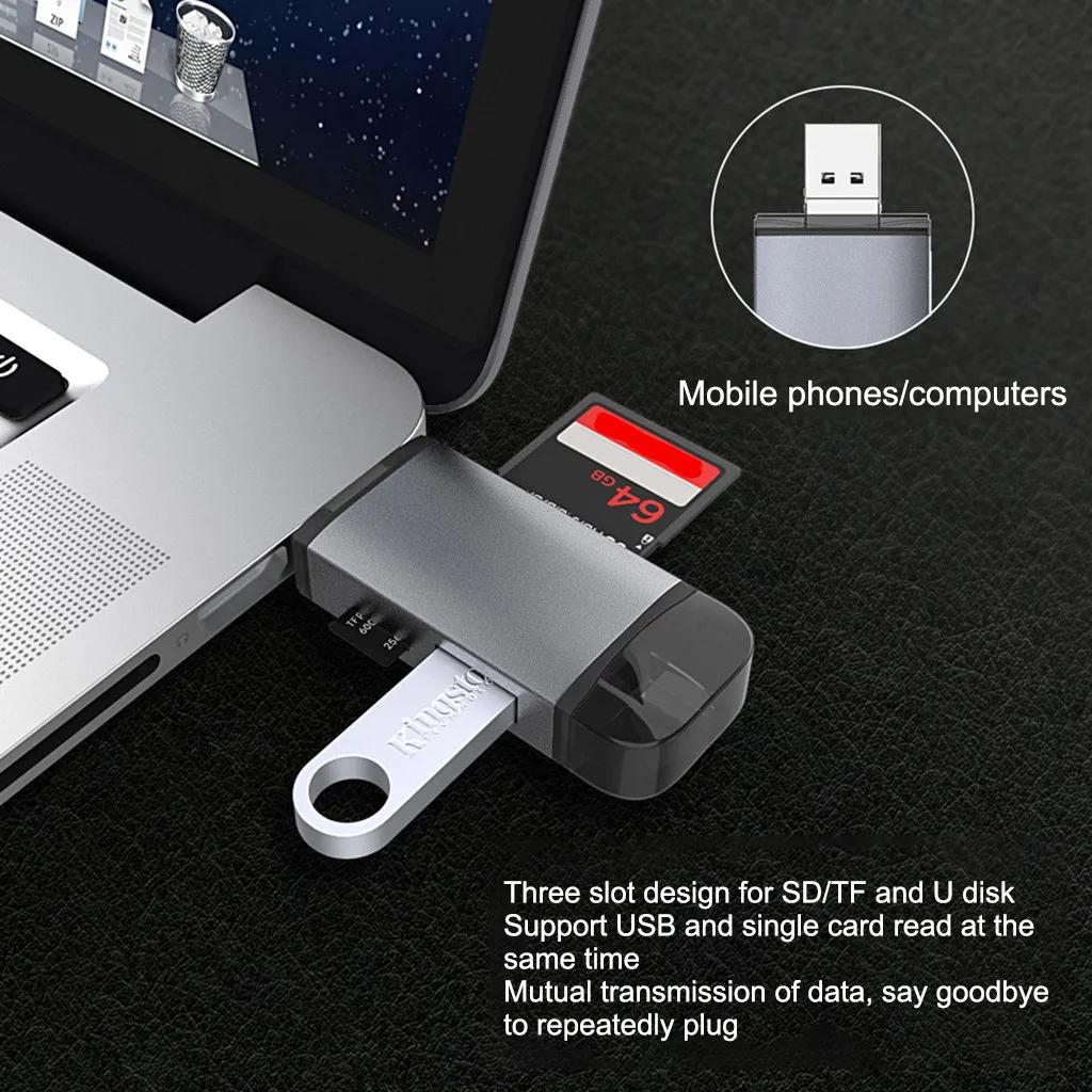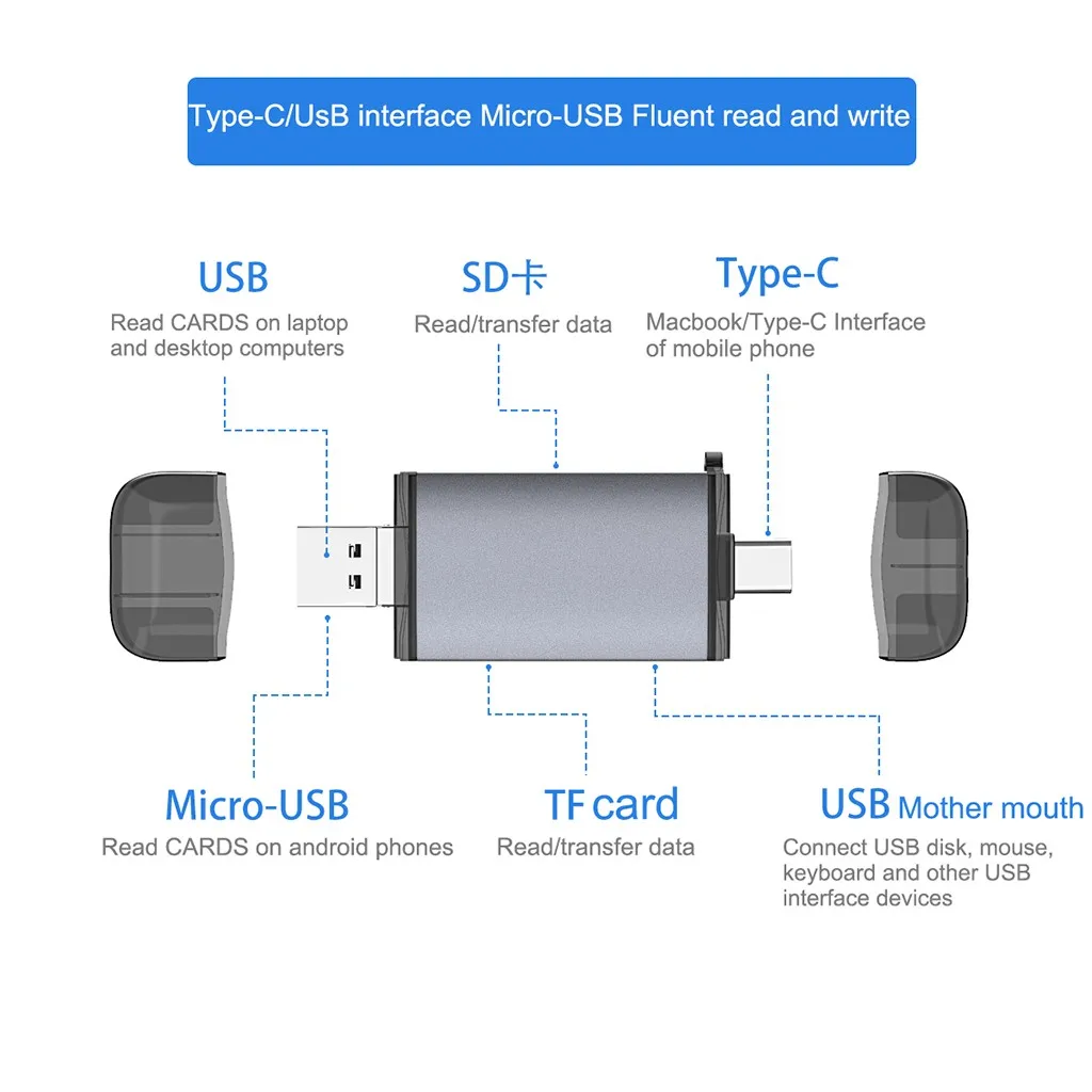 USB 2,0 кард-ридер --- Позволяет передавать данные со скоростью до 5 Гбит/с для более короткого времени синхронизации. Обратная совместимость с USB 1,1 Микро OTG / USB C OTG Адаптер --- передача файлов, фотографий, видео с TF/sd-карты на ваш компьютер, Android сотовый телефон, для Android планшет, и USB C ноутбуки, сотовые телефоны, Планшеты удобно. Добавление дополнительной карты памяти на мобильные телефоны OTG Храните больше фильмов, фотографий, музыки и наслаждайтесь ими Все в одном кардридер --- Поддержка чтения/записи SD, TF, Micro USB, USB, Type C,USB mother mouth. Тонкий и портативный дизайн --- Размер 2,75x0,82x0,35 дюймов. Легко брать. Крышка из алюминиевого сплава делает его Прочная и устойчивая к загрязнению. Подключи и работай, драйвер не требуется Широкая совместимость --- Стандартный USB разъем (тип A), микро USB разъем (тип B) сочетание, что делает это Кардридер совместим со всеми планшетами и смартфонами Android/ USB C, которые Поддержка функции OTGСпецификация:
