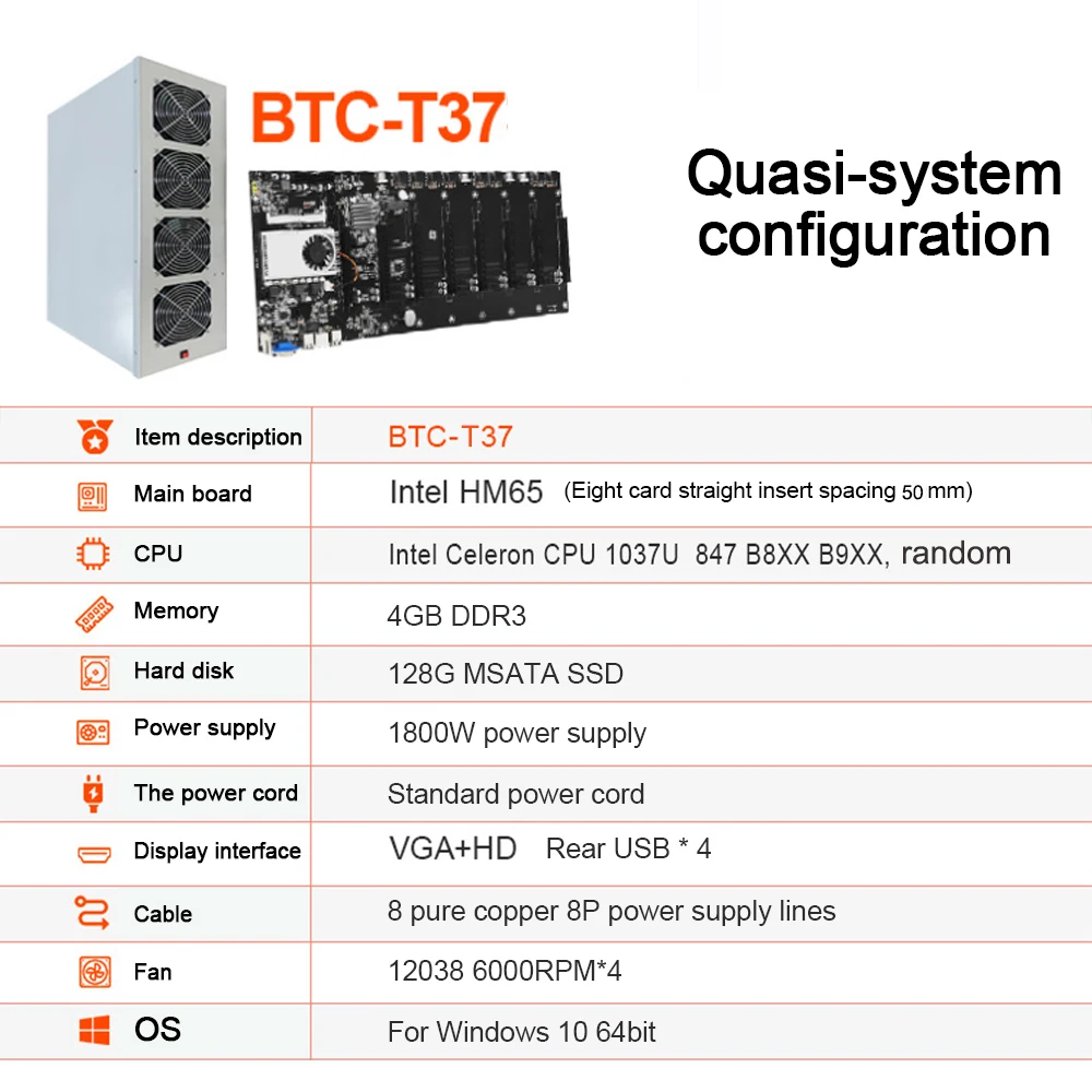 Описание: Этот продукт представляет собой комплект материнской платы для горнодобывающей машины, низкое энергопотребление, меньшее тепловыделение, энергосбережение и безопасное использование.Слот для памяти, 8 разъемов для видеокарты.Работа для вас длительная и полезная.Стабилизирующий конденсатор напряжения может обеспечить стабильное напряжение для вашего оборудования электропитания.Он может обеспечить бесшумную работу, низкое энергопотребление, меньшее количество тепла, энергосбережение и безопасное использование. Спецификация:Посылка A:Материнская плата: BTC-T37Цвет: черныйМатеринская плата: Intel HM77 8-карточный линейный интервал 50 ммПроцессор: intel®Celeron®CPU 1037U @ 1,80 ГГцИнтерфейс дисплея: VGA + HDMI-совместимый интерфейс USB задний * 4Память: 1 * DDR3 sodimm разъем, поддержка 1066/1333/1600 МГцХранение: 1 * SATA3.0 + 1 * SATA2.0 + 1 * m SATA2.0USB: 4 * USB2.0 + 2 * передний USB2.0 pinМногофункциональная карта: ITE IT8772EРасширяемый порт: 8 * PCIE16X1 * SATA3.0 + 1 * SATA2.0 + 1 * mSATA2.0 интерфейс жесткого дискаБлок питания: ATX24 PINРазмер: 470 мм * 195 ммВентиляторы: 4 вентилятора 12038 6000 об/минРазмер шасси: 58*400*180 мм Посылка B:Вентиляторы: 4 вентилятора 12038 6000 об/минРазмер шасси: 585*400*180 ммНет материнской платы Посылка C: Наименование товара: BTC-T37Память: разъем DDR3 Sodimm, поддержка 1066/1333/1600 МГцХранение: SATA3.0 + SATA2.0 + SATA2.0USB: 4xUSB2.0Сетевой порт: гигабитный сетевой порт RJ45Расширяемый Порты и разъёмы: 8xPCIE 16X,16x6PIN PCI-E X16 Питание гнездо, совместимому с HDMI + VGAРазмер материнской платы: 554x195ммВентиляторы: 4 вентилятора 12038 6000 об/минРазмер шасси: 630x400x180ммНет источника питанияНет 4 ГБ ddr3Нет 128G SSDБез шнура питанияНет линии питания 8pПримечание:-Материнская плата не имеет кнопочного аккумулятора и ее необходимо приобретать отдельно.-Возможны небольшие погрешности в размере при ручном измерении.-Из-за различных эффектов освещения и настроек монитора фактический цвет товара может не точно отражать цвет на фотографиях.