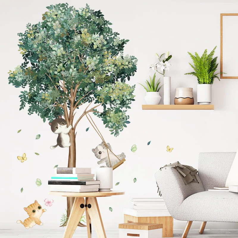 Милые виниловые наклейки на стену в виде качели, котенка, для детской комнаты, спальни, украшение на стену, наклейки с зеленым деревом для гостиной, художественное оформление, домашнее украшение