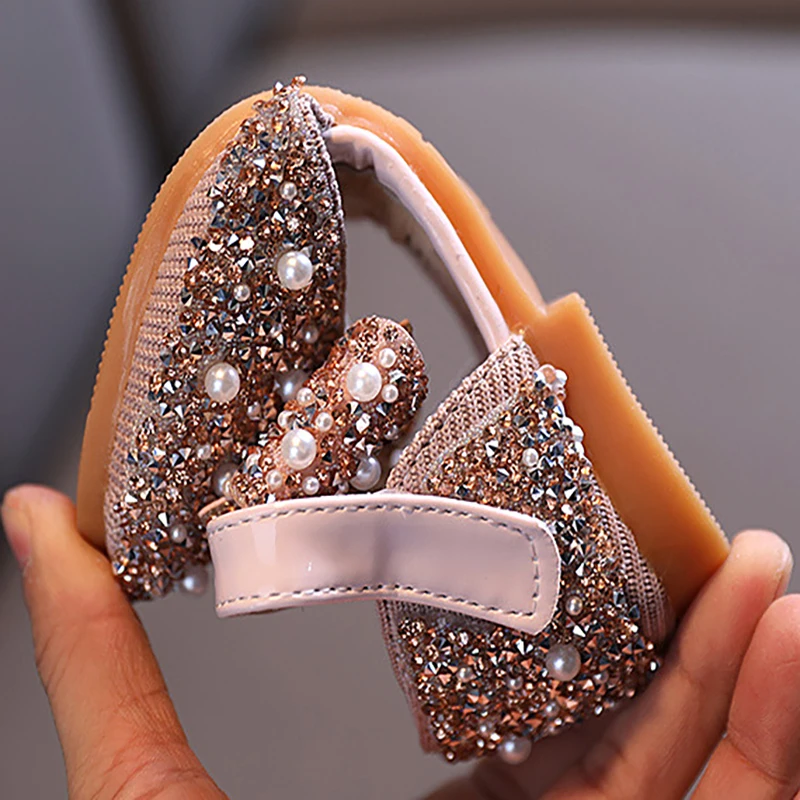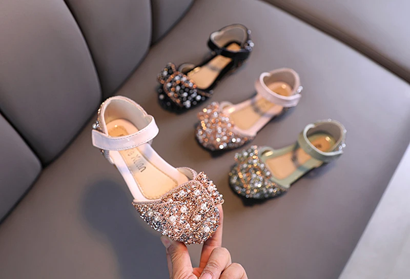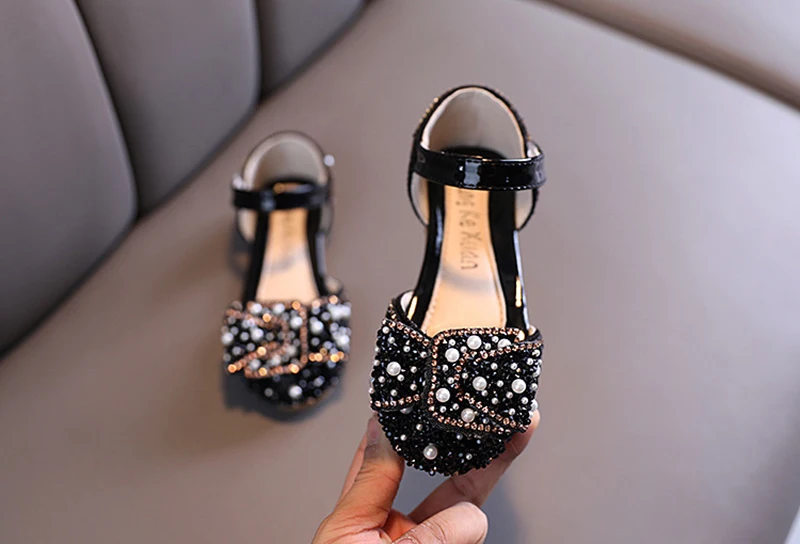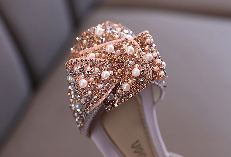 Сандалии для девочек; Летняя обувь принцессы с блестками и кружевным бантом; Детская обувь; Милые повседневные туфли для танцев с жемчужинами; Детские вечерние свадебные туфли